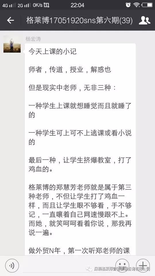 也有刚加入外贸行业的小伙伴说,原本对SNS毫无概念,更不知道其中竟然隐藏了这么大的客户。通过这次参加格莱博郑慧芳老师的SNS课程,现场实操,不懂的能现场问老师,并及时得到解决,在课上马上就收获。了大量精准客户的关注和点赞,效果十分震撼。