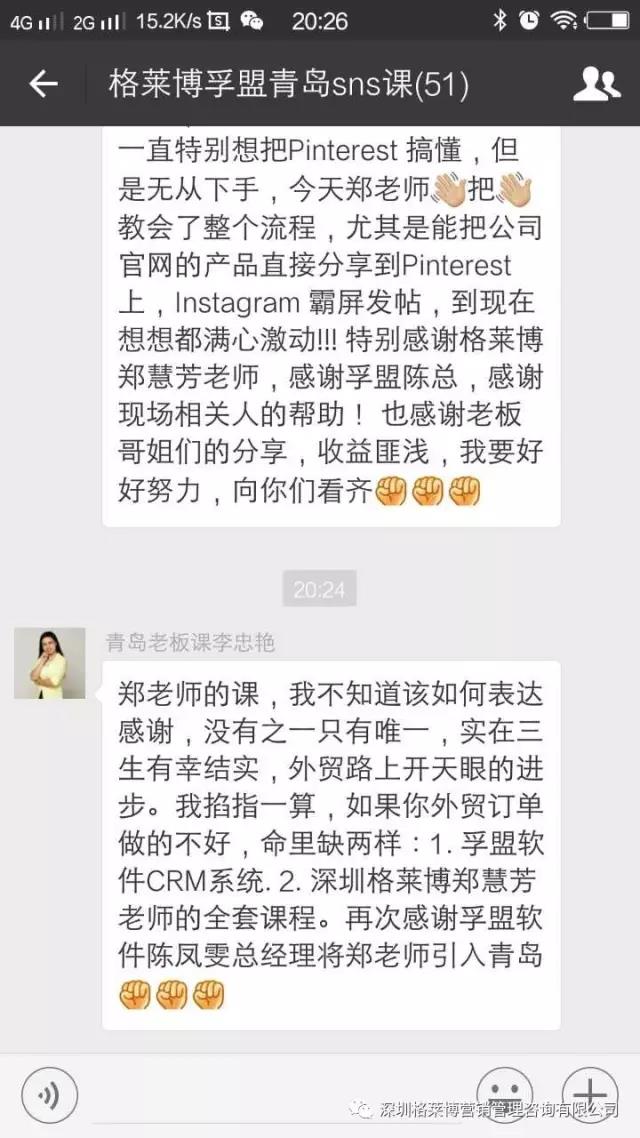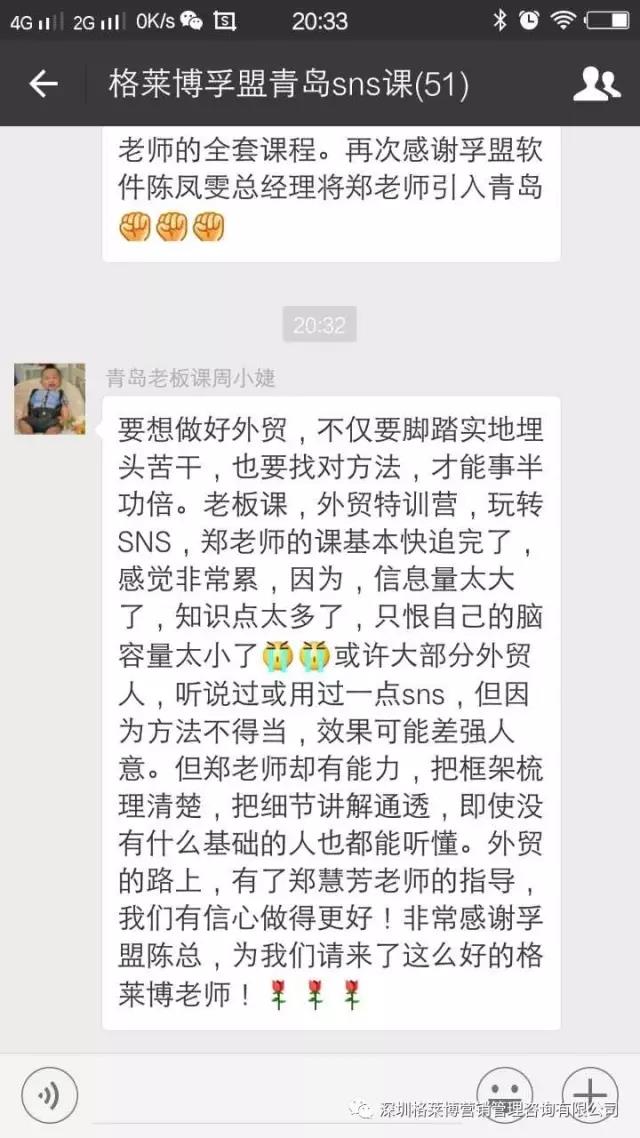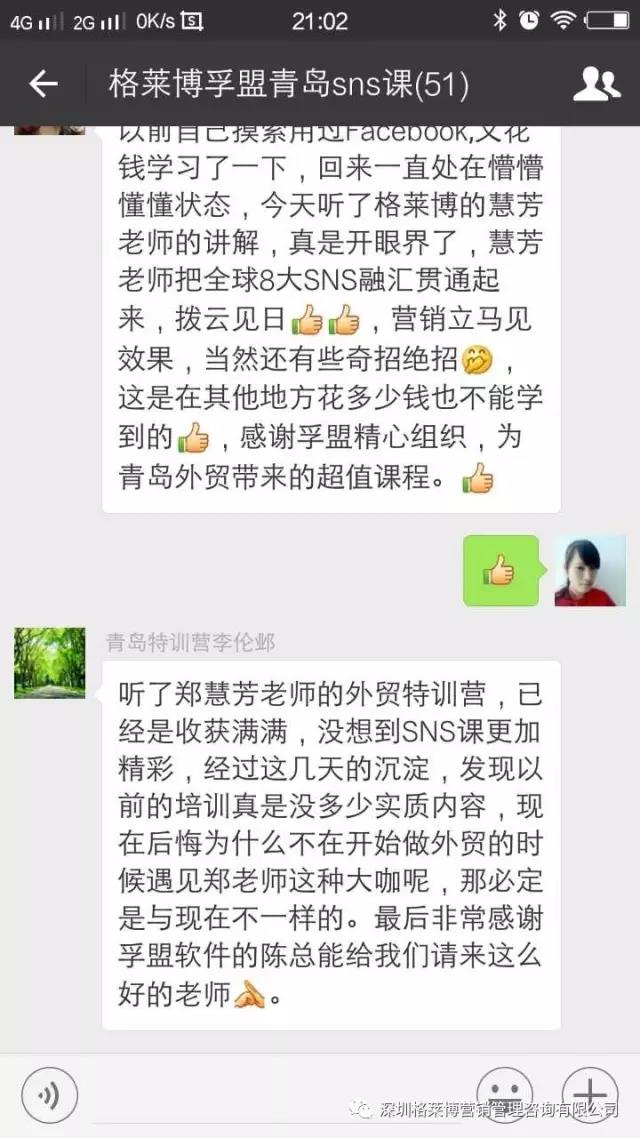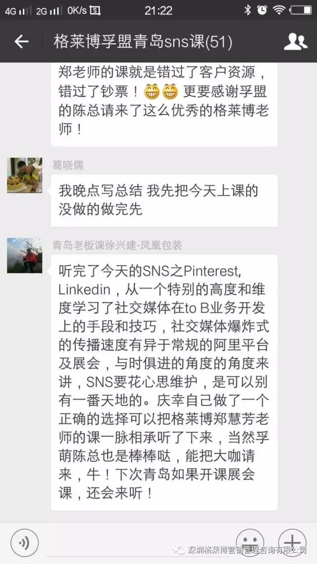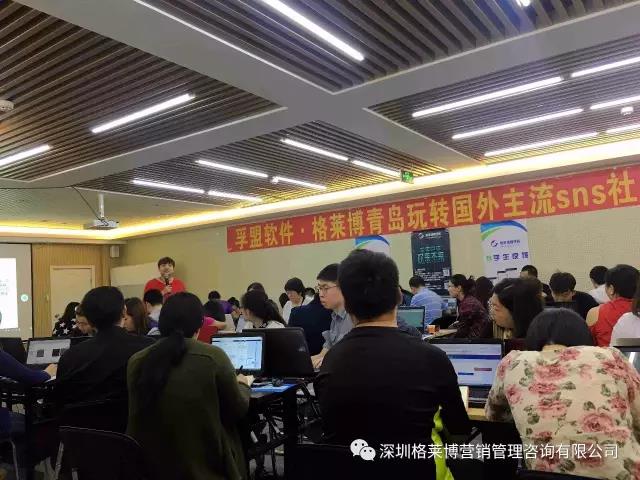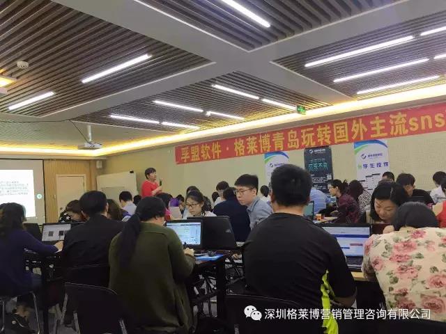 这是一个不一样的五月。在青岛,格莱博联合孚盟软件,慧芳老师三课连开,刷爆青岛外贸朋友圈。最后的SNS课程上,大家依旧热情不减。课程前一天就有学员从深圳,河北等地赶过来。在课程的第一天早上不到八点,就有学员来到教室,很多学员都是三课连上,其中更是有八个月的孕妈。
