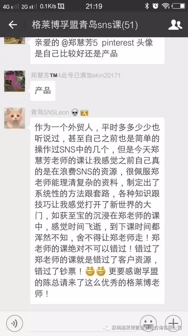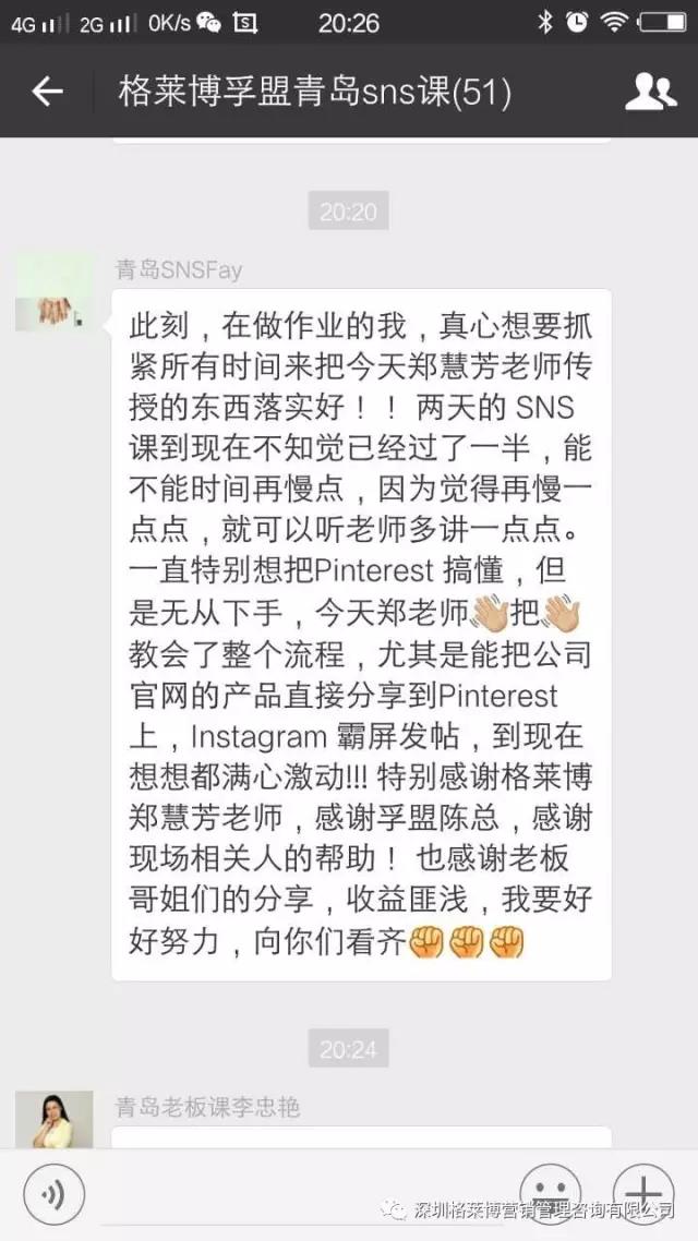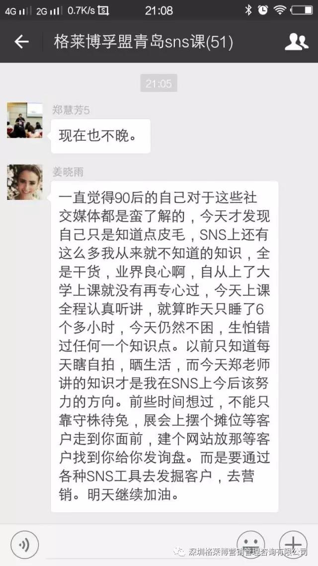 细节决定成败,效率成就未来,有学员说两天的SNS课程让自己看到慧芳老师对社交网络的把控,之前自己一直游走于表面,现在明白距离突破只有一个细节的距离。还有学员说以前接触的那些所谓的SNS简直弱爆了,慧芳老师讲的每一句话都是一个知识点,相信社交营销真的可以给自己的外贸业务带来新的拓展,马上就去落地。