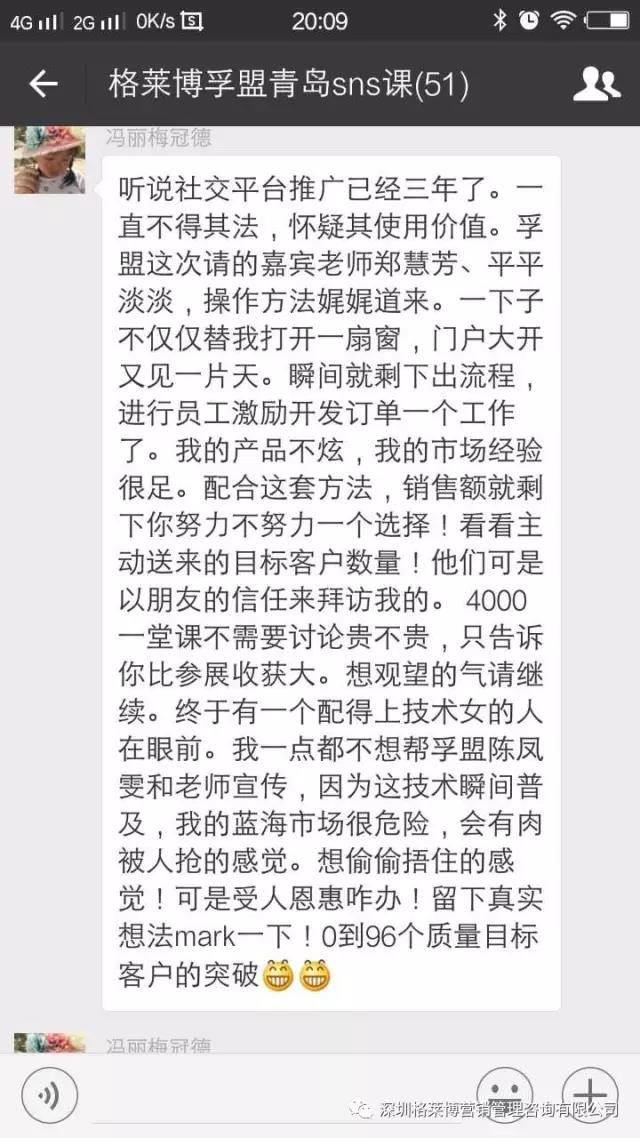 在课程上,很多学员表示之前也有参加过其他SNS的课程,但花了一两万,也只学了些皮毛,跟网络营销都根本沾不上边,但慧芳老师却有能力把框架梳理清楚,把细节讲透,即使没有基础的人也能听懂。要感谢孚盟把郑老师引入青岛,让大家开始有信心做的更好。
