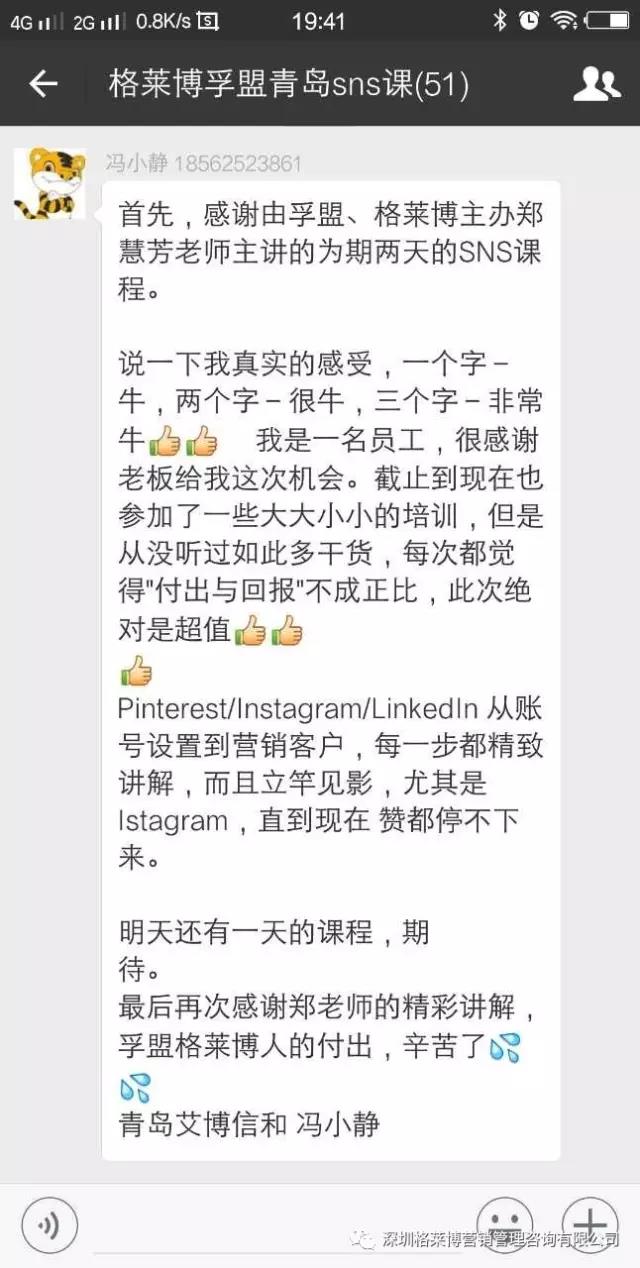 想做好外贸,不仅要脚踏实地,埋头苦干,也要找对方法,才能事半功倍。有学员说老板课,外贸特训营,玩转SNS,郑老师的课基本上已经追完了,感觉非常累,因为信息量太大,知识点太多,只恨自己脑容量太小,Pinterest,lnstagram,Linkedln等,从账号设置到营销客户,每一步都细致讲解,而且立竿见影,尤其是Instagram,直到现在,赞都停不下来。