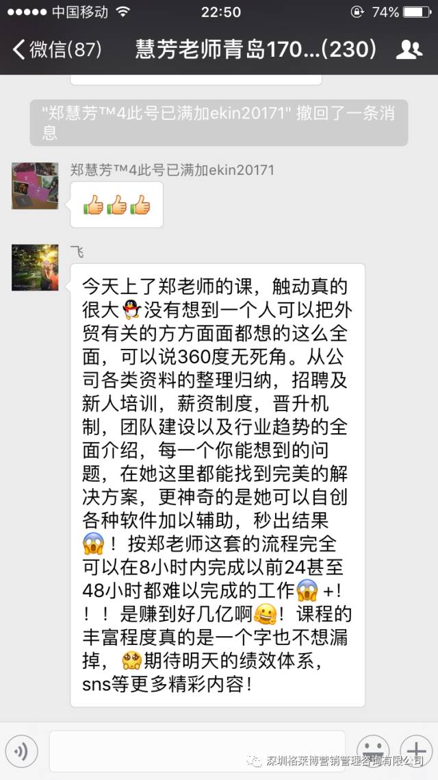 有学员表示老师的课程让自己豁然开朗,对于管理外贸团队,之前不知道如何更快速准确下手,之前做外贸,从来没有像今天这么系统起来,而且都是实招,招招切中要点,回去就可以实行。