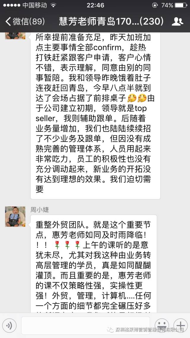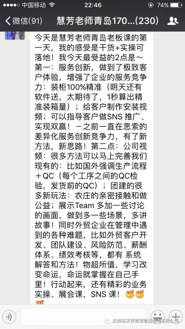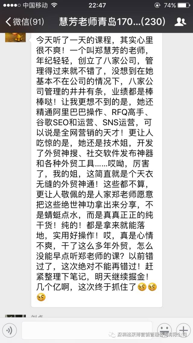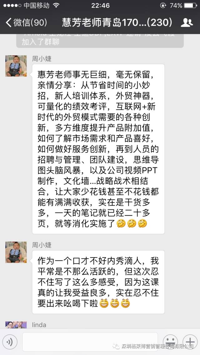 课程后,大家纷纷表示想把老师装回自己的公司,说要感谢孚盟软件引进了这么牛,只讲干货的老师,为青岛5月份外贸圈又增加了了一个大事。做业务,带团队,搞管理,在慧芳老师这里方子都已经开好了,还感叹为什么没有早几年认识慧芳老师,可以少走多少弯路。