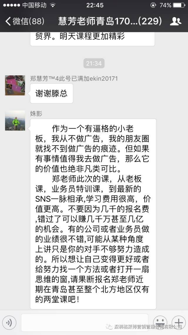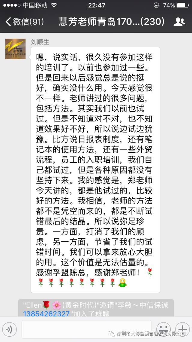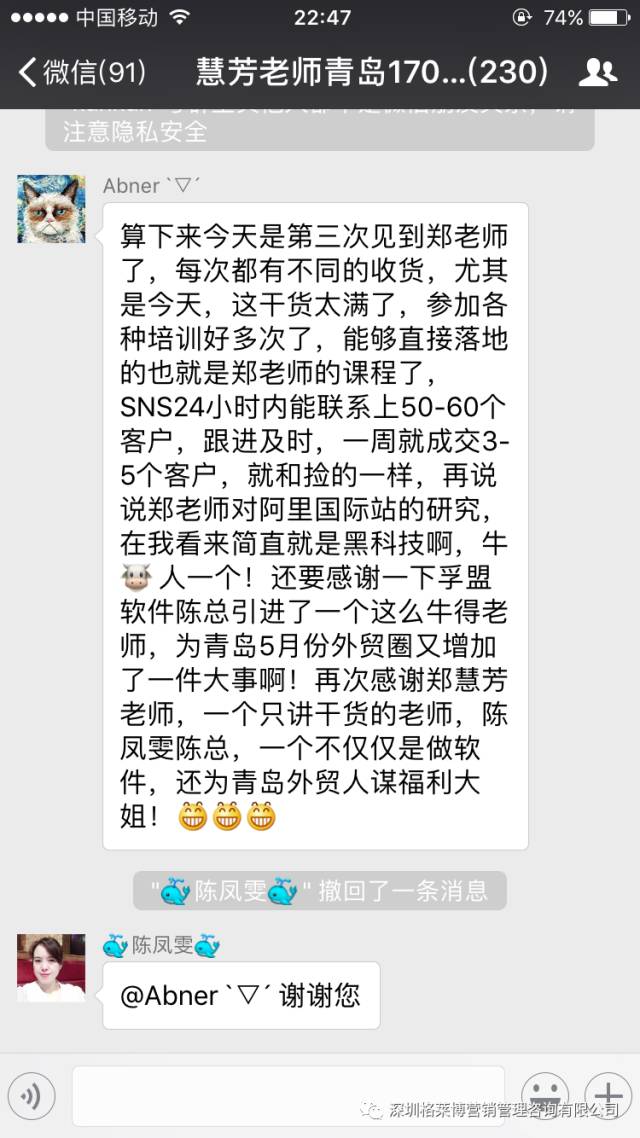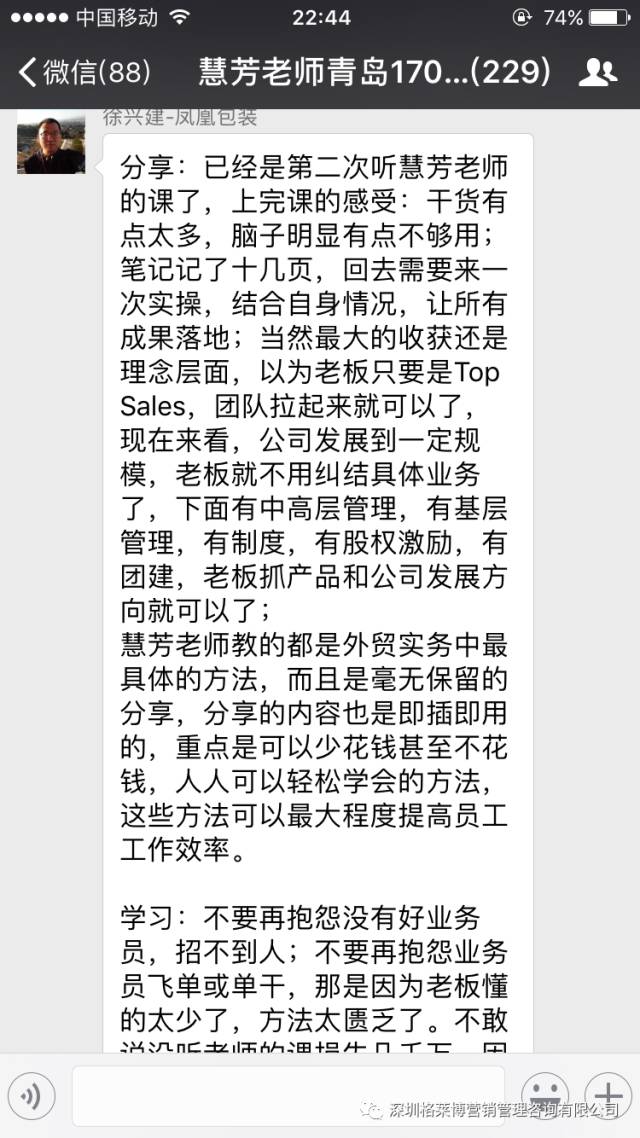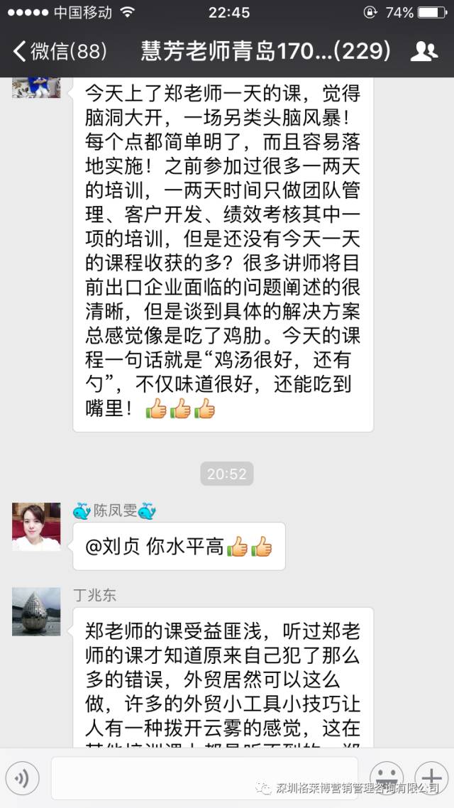 课程后,大家纷纷表示想把老师装回自己的公司,说要感谢孚盟软件引进了这么牛,只讲干货的老师,为青岛5月份外贸圈又增加了了一个大事。做业务,带团队,搞管理,在慧芳老师这里方子都已经开好了,还感叹为什么没有早几年认识慧芳老师,可以少走多少弯路。