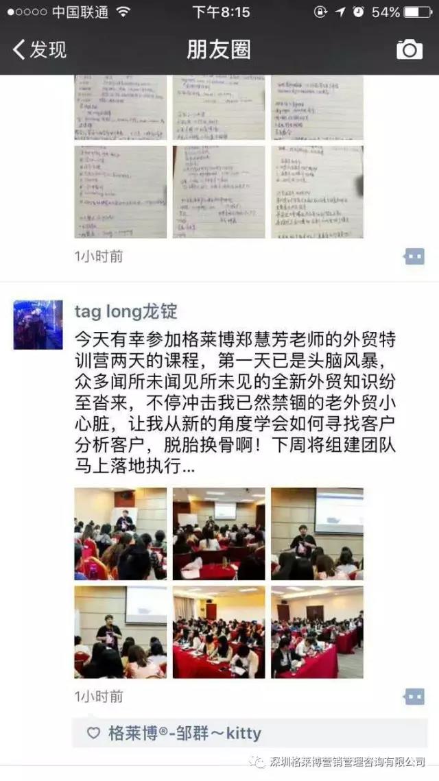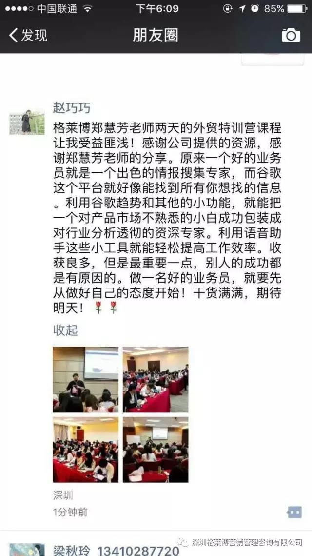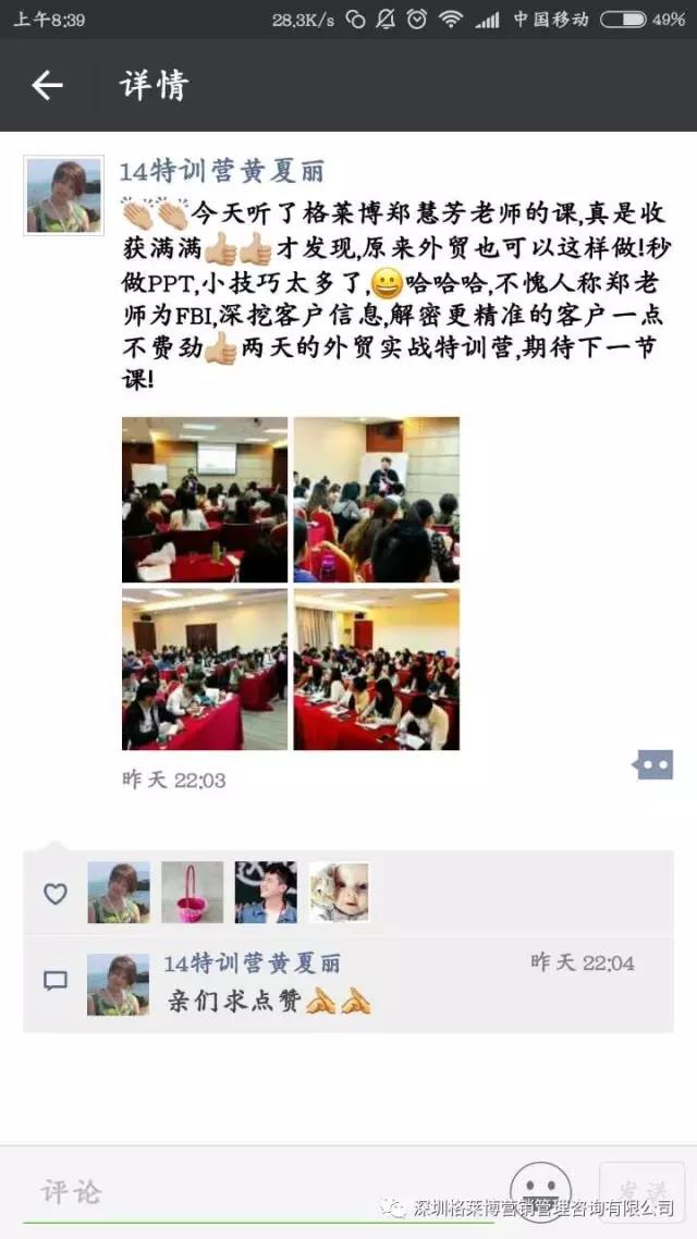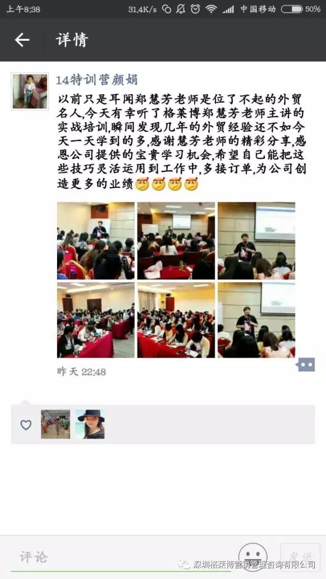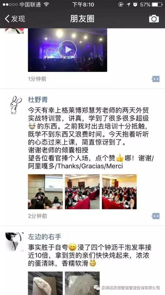还有学员表示听了格莱博郑慧芳老师主讲的实战培训,瞬间发现几年的外贸经验还不如一天的学习。不管是从开发客户的各种方法灵活运用上,还是在分析客户,时间管理,对待客户的那些细节处理等等方面,大家都是受益匪浅!