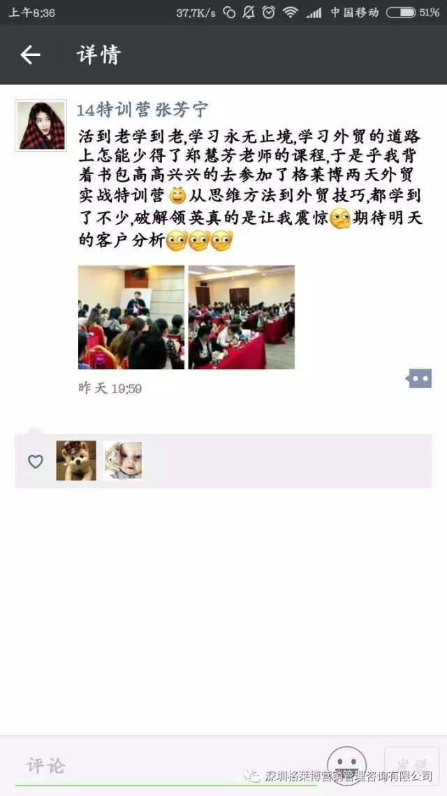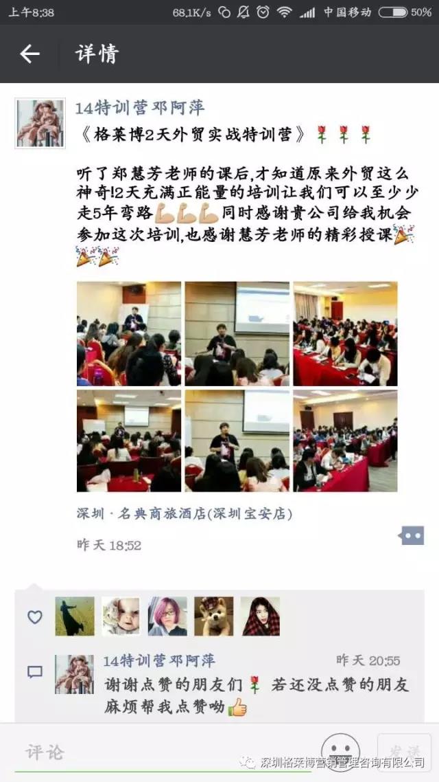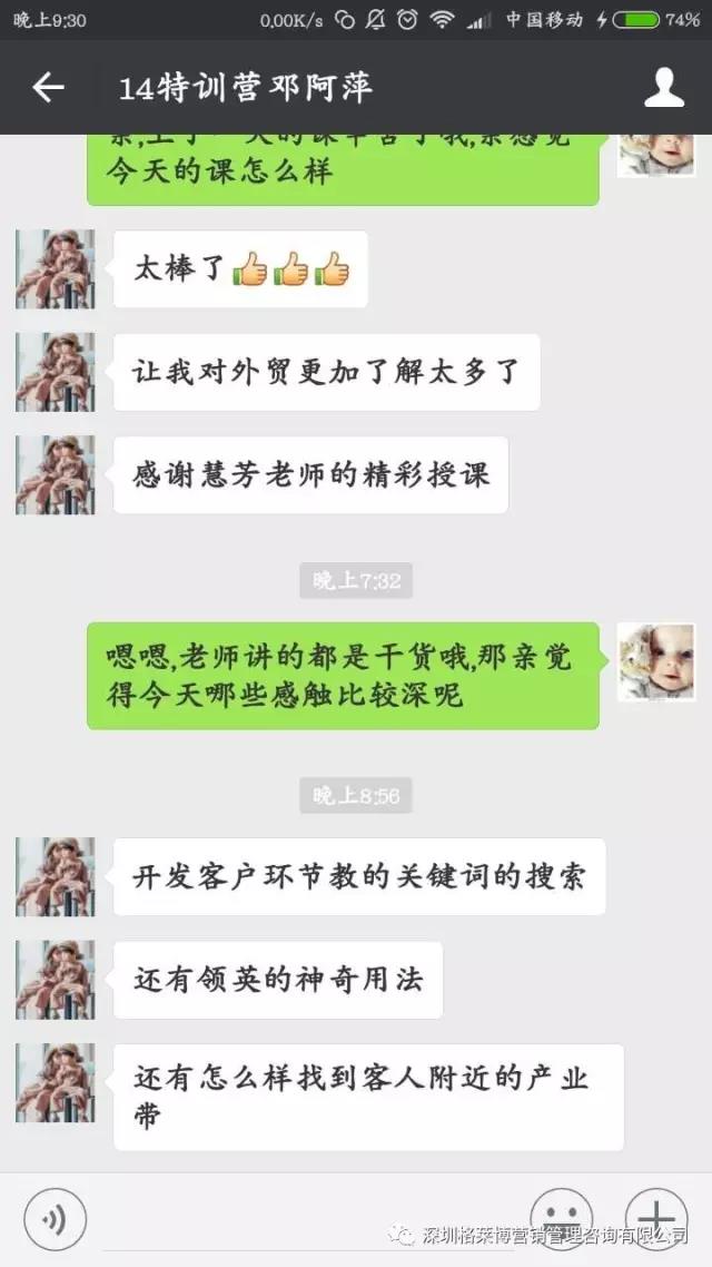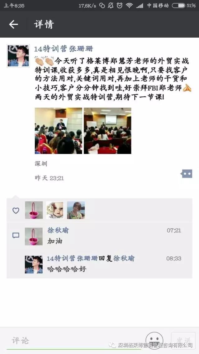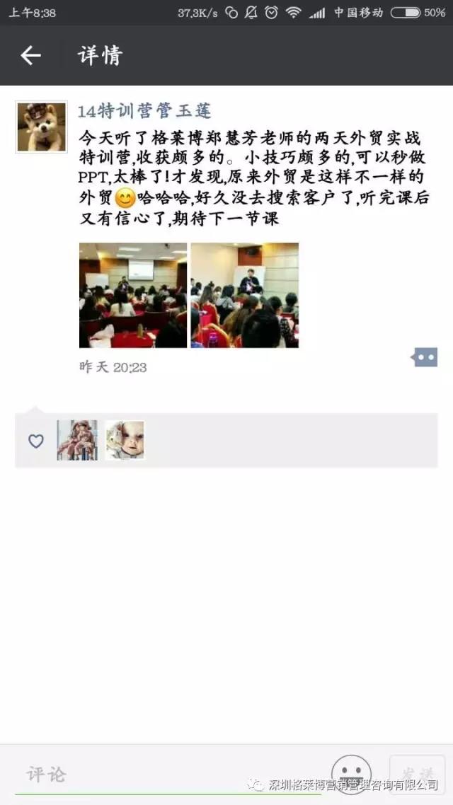 还有学员表示听了格莱博郑慧芳老师主讲的实战培训,瞬间发现几年的外贸经验还不如一天的学习。不管是从开发客户的各种方法灵活运用上,还是在分析客户,时间管理,对待客户的那些细节处理等等方面,大家都是受益匪浅!