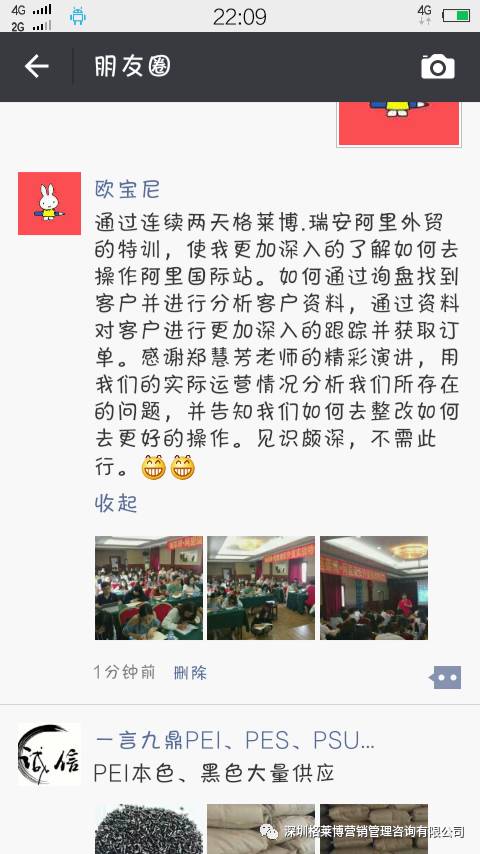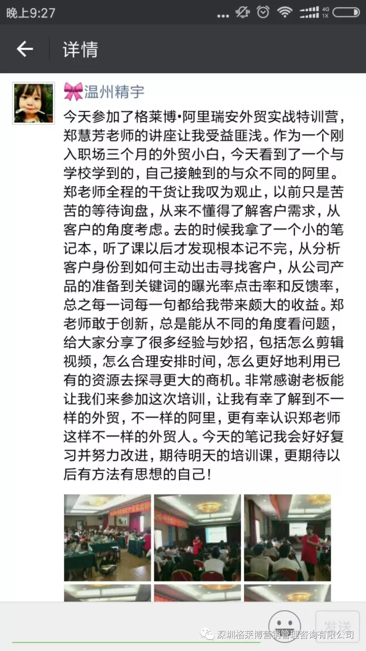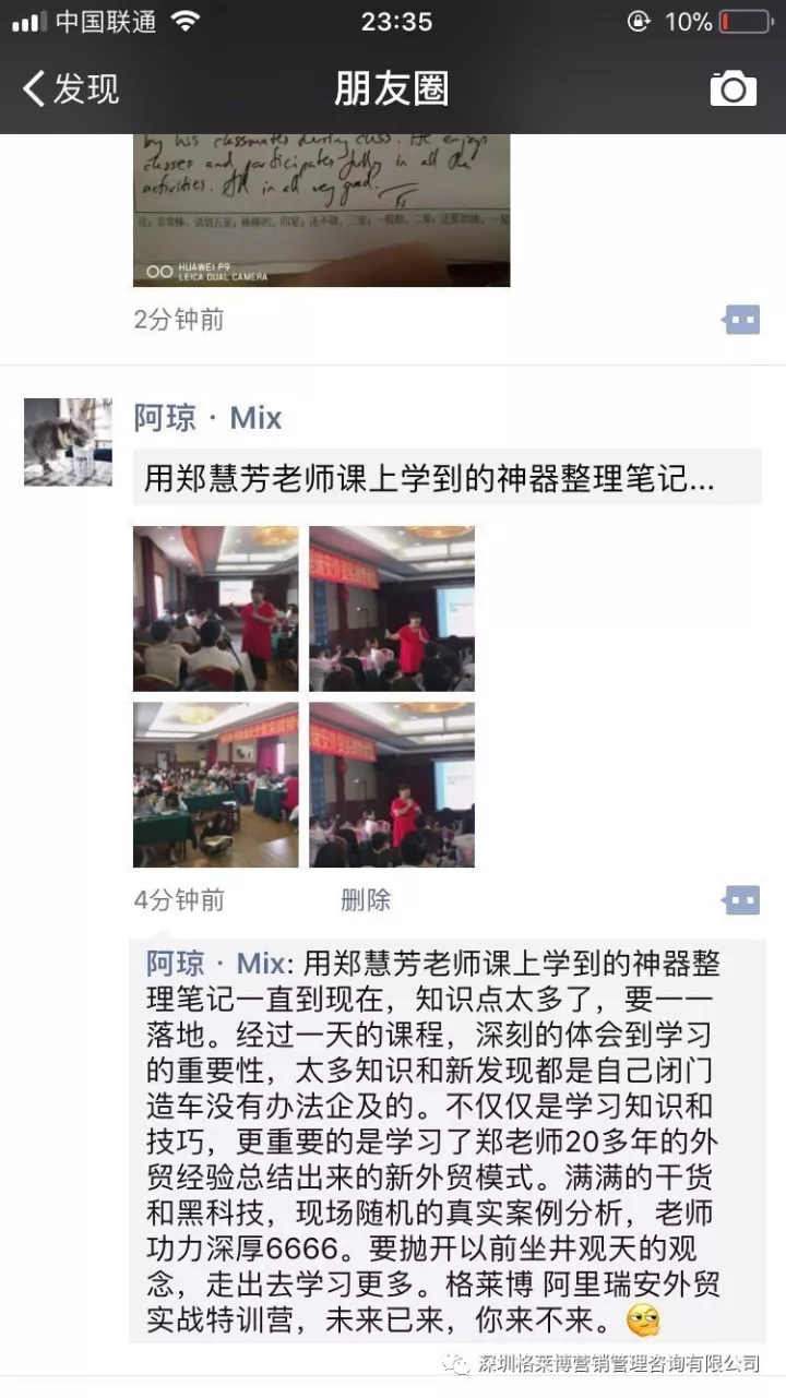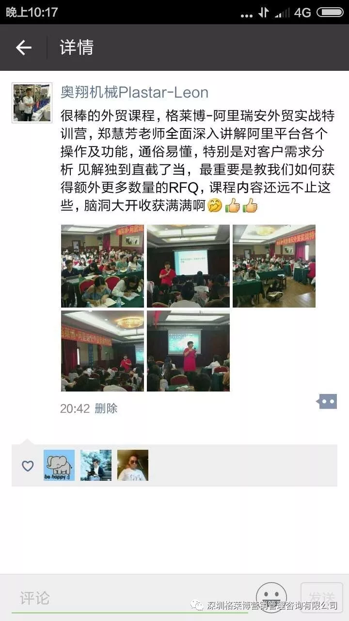 还有学员说这次课程真的赚到了,学到了视频和PPT可以这样快速有效的制作,明白了RFQ居然可以这样玩,了解了SNS还可以有这些技巧,最重要还学习到了从未见识过的多维度分析客人的绝对值钱的外贸软件,慧芳老师不愧是外贸精英界的FBI,从老师嘴里说出来的都是满满的干货。