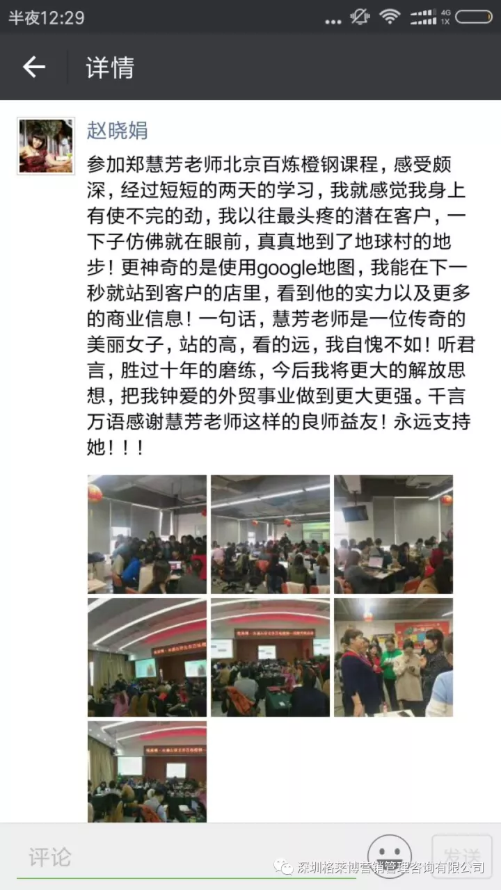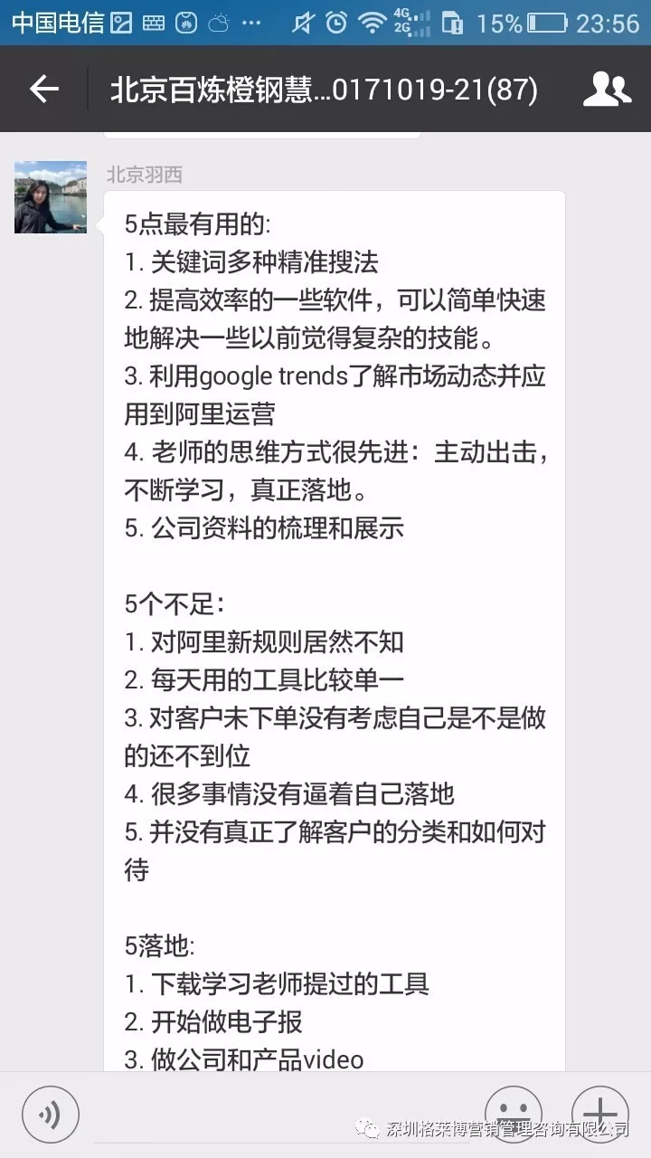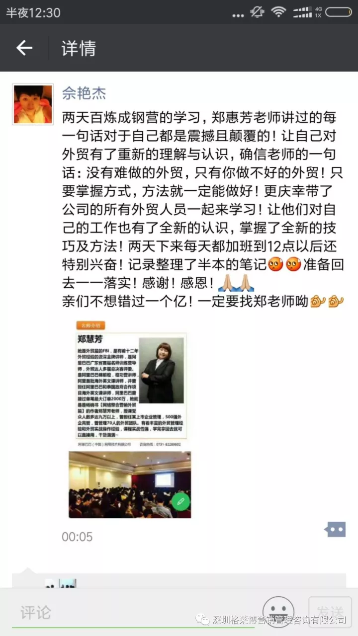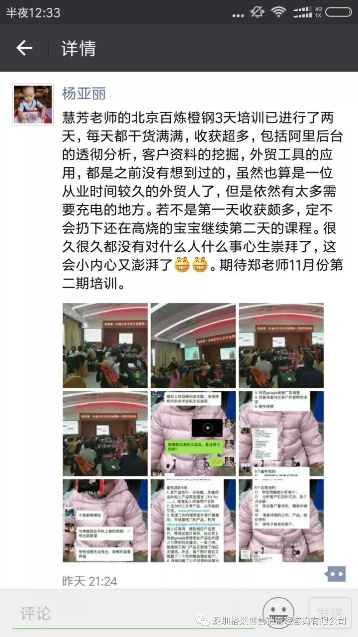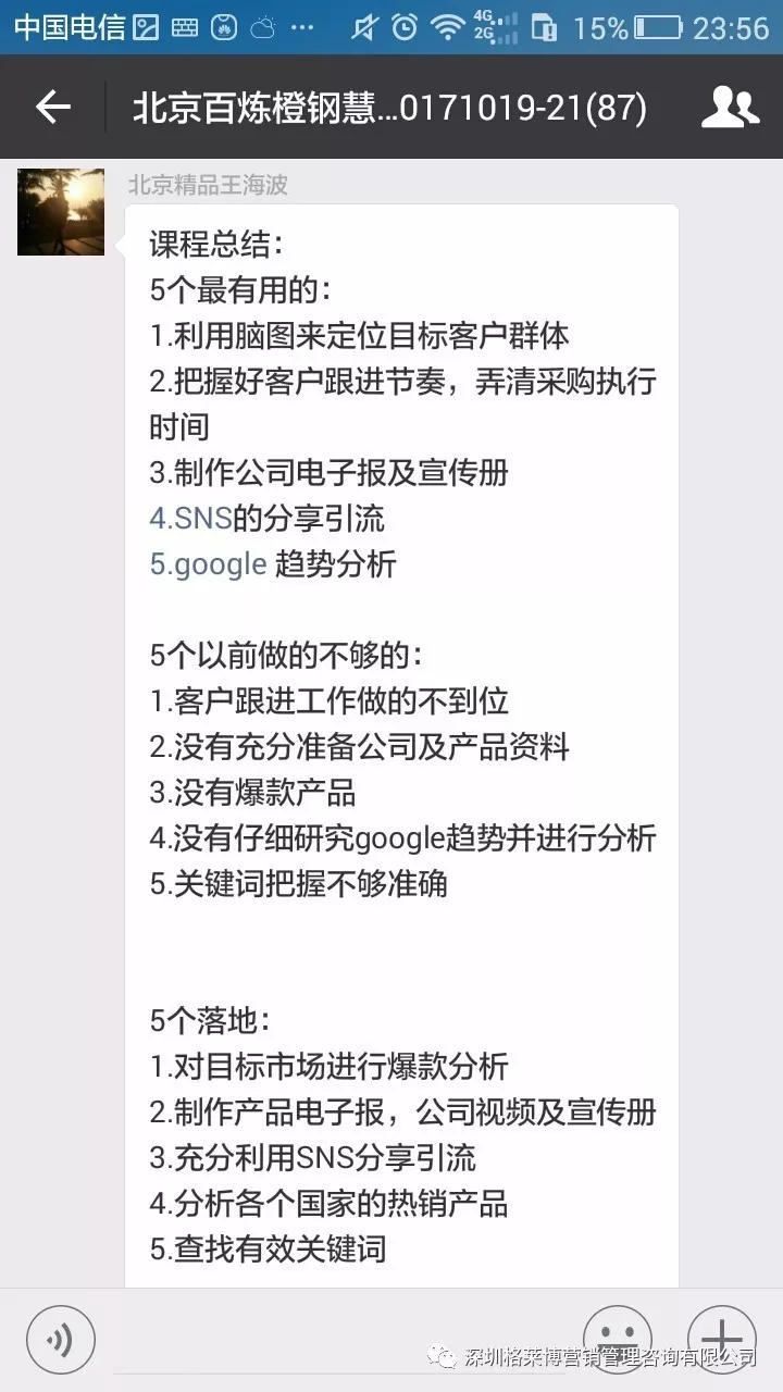 课程结束之后,学员们纷纷发来感想,感谢慧芳老师的干货分享!三天课程下来,同学辛苦了!希望你们回去按照郑老师讲的操作方法,好好落地,利用老师教的办法和操作进行实战,相信你们能拿下大订单!回来跟郑老师、同学们报喜。