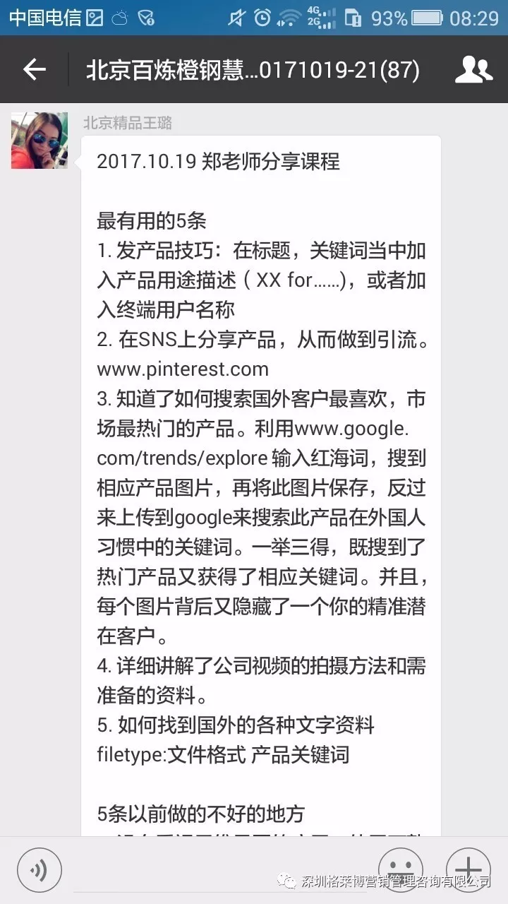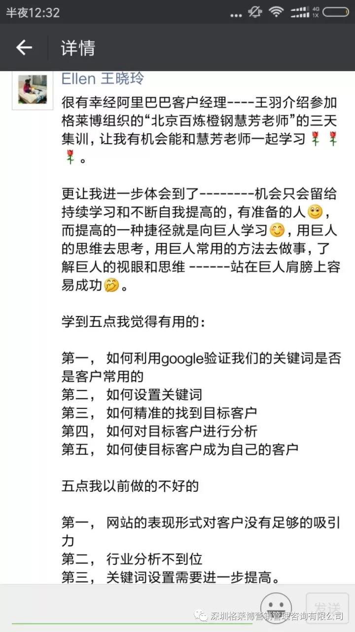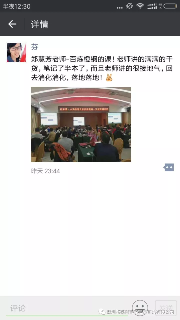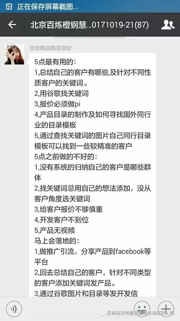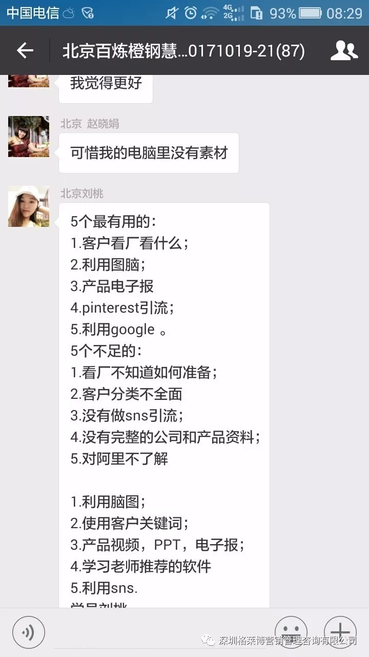 课程结束之后,学员们纷纷发来感想,感谢慧芳老师的干货分享!三天课程下来,同学辛苦了!希望你们回去按照郑老师讲的操作方法,好好落地,利用老师教的办法和操作进行实战,相信你们能拿下大订单!回来跟郑老师、同学们报喜。
