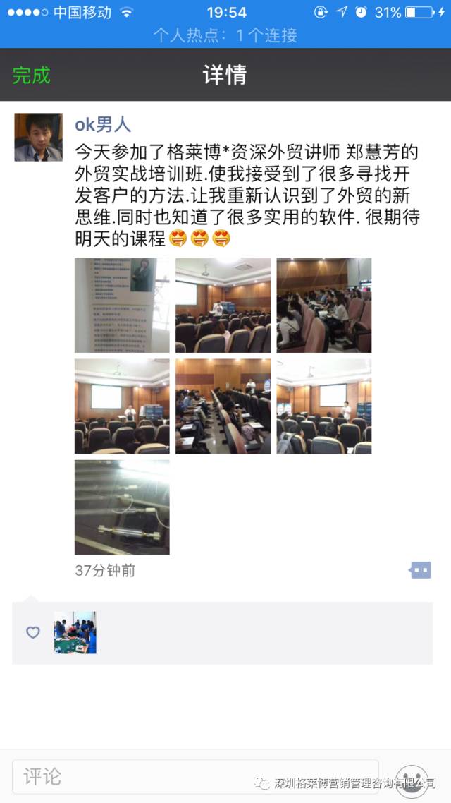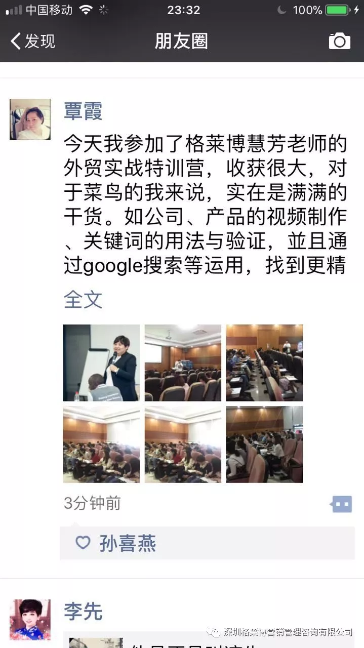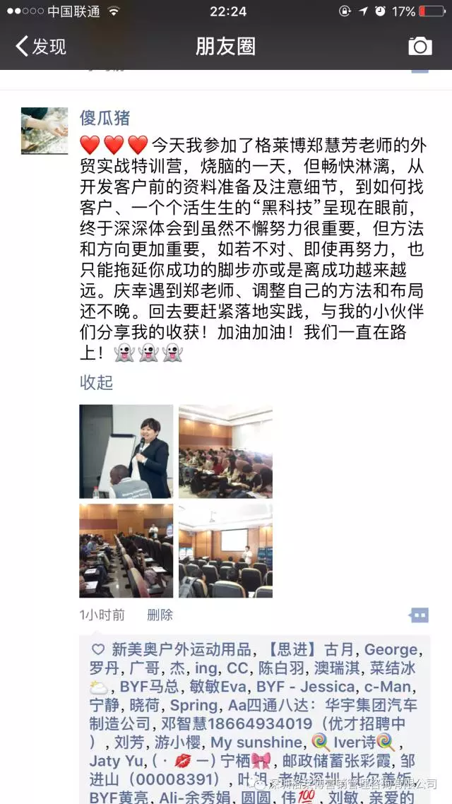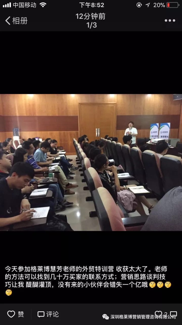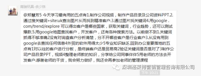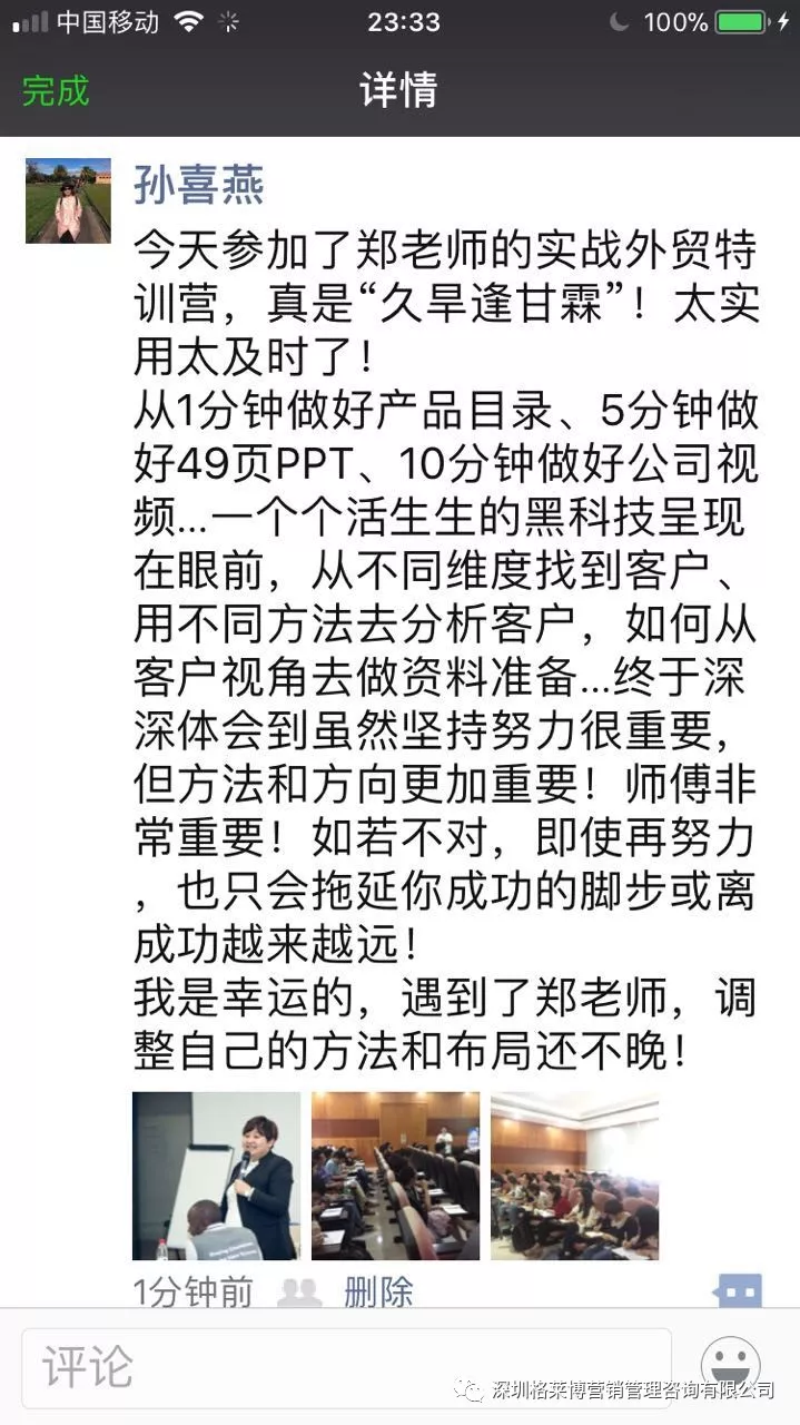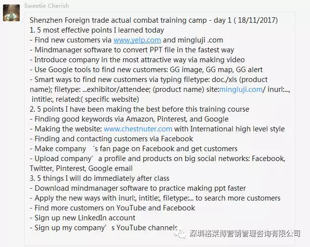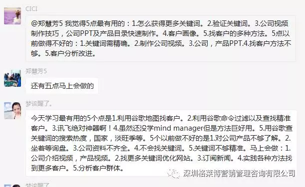 有学员感叹参加了慧芳老师的课程,满满的都是干货,发现自己以前的客户都是捡回来的不是自己去挖掘的,更有学员表示上课之后发现外贸不难做,只是没有找到合适办法,上慧芳老师一节课,少走五年弯路,真的超值。烧脑的一天,但是畅快淋漓,一个个活生生的黑科技呈现在眼前,庆幸遇到郑老师!!!亲爱的学员们,一个亿在等着你们!加油。