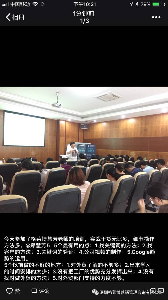 第二天外贸界FBI郑慧劳老师从客户分析大法到阿里巴巴的操作,阿里巴巴后台数据如何分析客户,如何发布阿里巴巴产品标题,获得更多点击;如何写阿里巴巴产品详情,获得更多反馈;如何找到更多适合自己的关键词,五千一万关键词都不在话下。还有通过谷歌地图,谷歌图片深挖客户,怎么插入视频,如何做电子报等,以及邮件的深度讲解,包括标题应该怎么样写,怎样避免邮件进入垃圾箱,邮件正文怎样写抓住客户的心。像侦探一样客户读了你的邮件立刻知道,慧芳老师FBI的称号实至名归,让大家感叹套路太深,外贸路上从不缺努力的人,但只有好的方法+努力的结果才能事半功倍。有学员听了这两天的课程,才发现自己之前的都是皮毛,现在开阔了思路,拆掉了思维的墙,刷新了自己对外贸的看法。