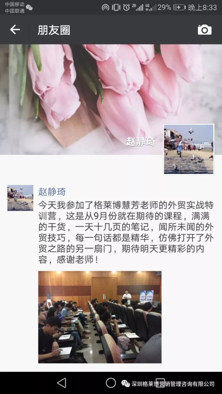 课程给大家的外贸世界打开了新的大门。郑老师的干货多到让大家应接不暇,如同经历头脑风暴。经过昨天的学习,把以前认为很多不可能、很多障碍都有了重新的认识,郑老师总能帮大家打开新思路,把大家碰到的销售线索往前推进一大步,还能突破到比原来更高的一个境界。