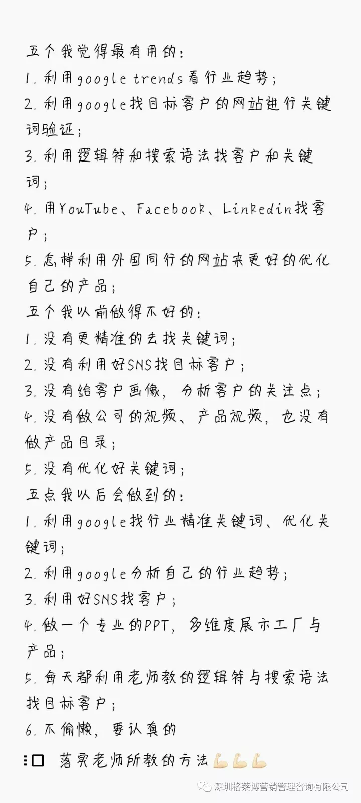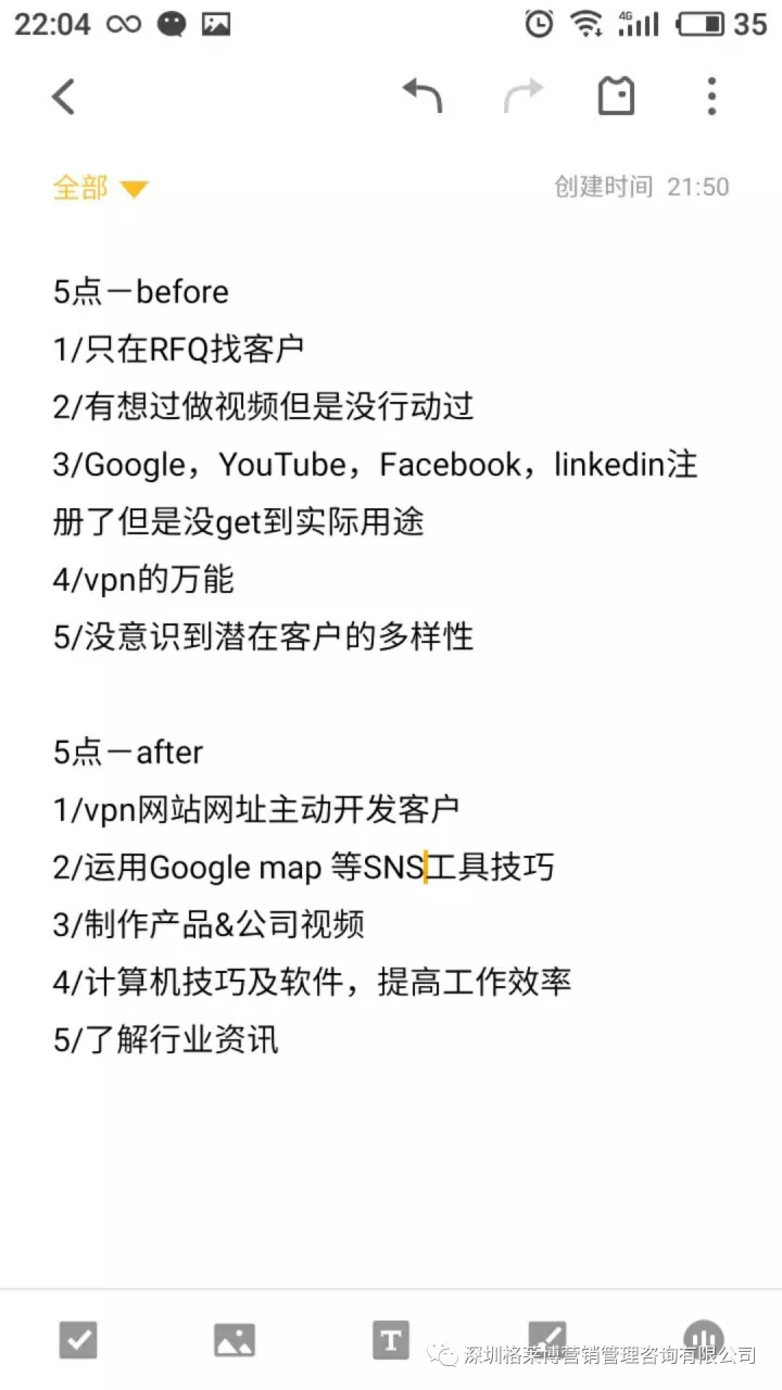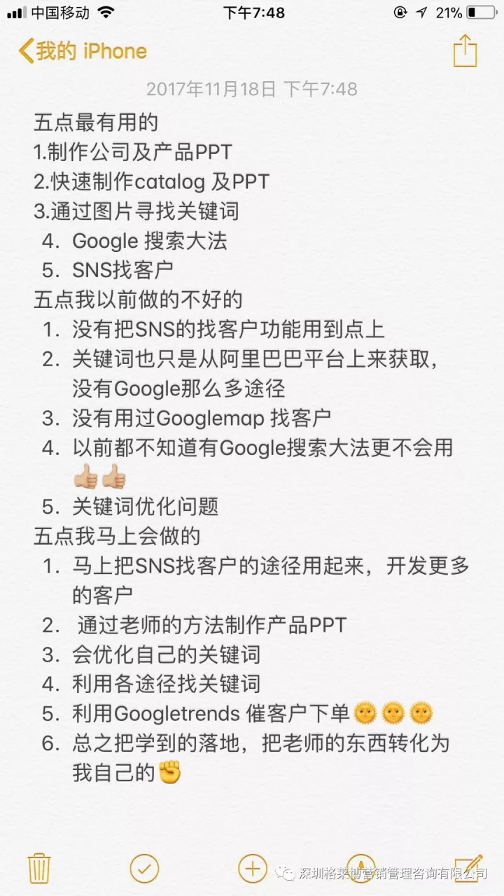 第一天课程就已是干货满满!!!慧芳老师的技巧就填满了学员的大脑,从关键词来源、优化关键词、关键词验证到国外客户喜欢的产品调研,如何制作最合适的公司视频及产品PPT。怎么样通过图片寻找到关键词找精准客户,如何分析市场,不再是只从阿里获取客户资源,还有独特的谷歌搜索大法和SNS平台找客户,慧芳老师更是直接用学员的案例作分析讲解,带大家用不一样的思路,学员们表示学习到了特别多的独特寻找客户的办法,重新认识了外贸的新思维,同时也了解到了更多的软件。