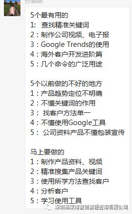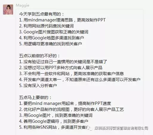没有华丽的辞藻,没有浮夸,全程干货,甚至颠覆了常规思路,打开了学员们的思维和视野,做外贸,努力很重要,方法更重要,学习能力和灵活运用技巧更重要。 但是大多数人一直疏忽了如何有针对性的去找含金量高的客户,并如何让客户短时间内对你有兴趣等重要因素,我们的慧芳老师帮您解决这个难题。有学员表示上了课发现自己开发客户时所做的一切都是无用功的,希望可以得到更多老师的办法去开发更多的客户,更有学员说此次课程全场高能,受益匪浅,开阔了自己对外贸新的认知领域,不虚此行。