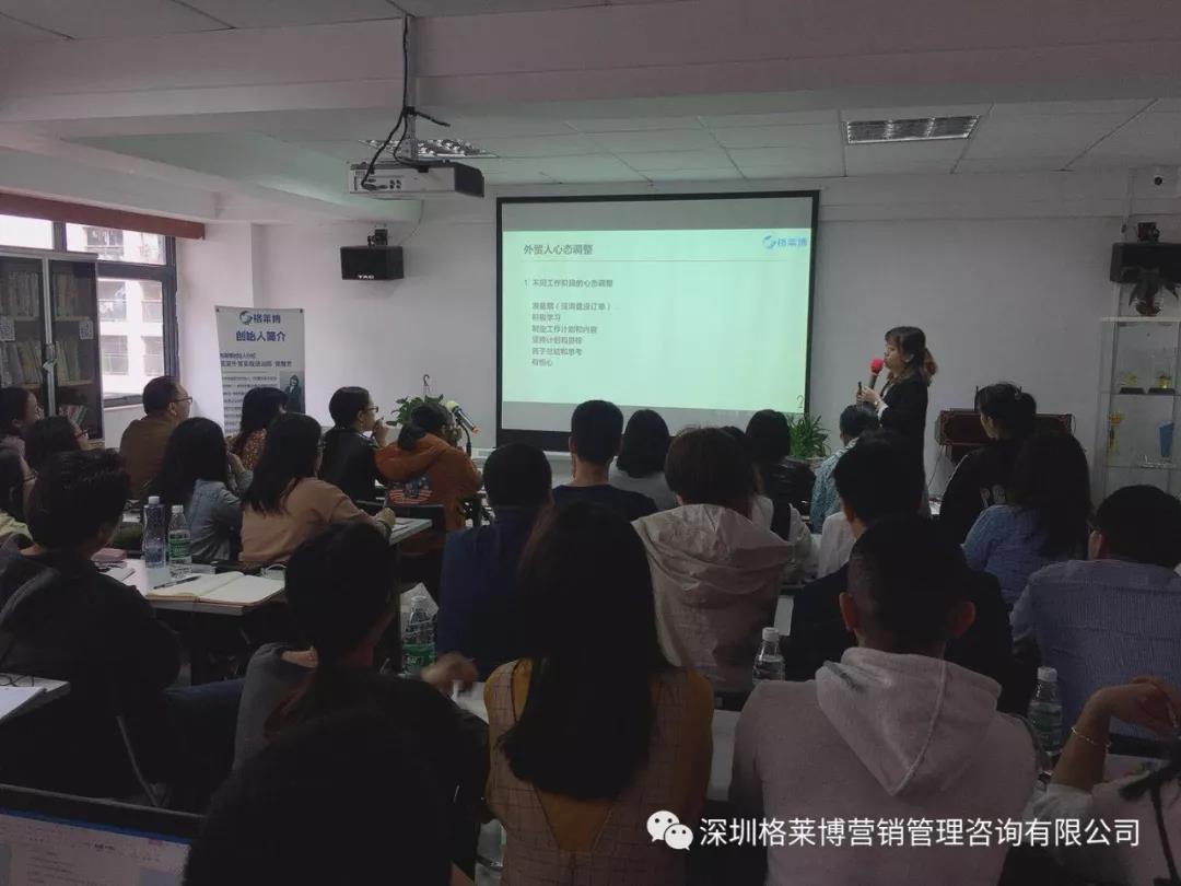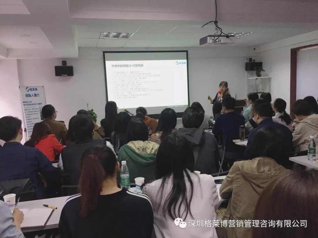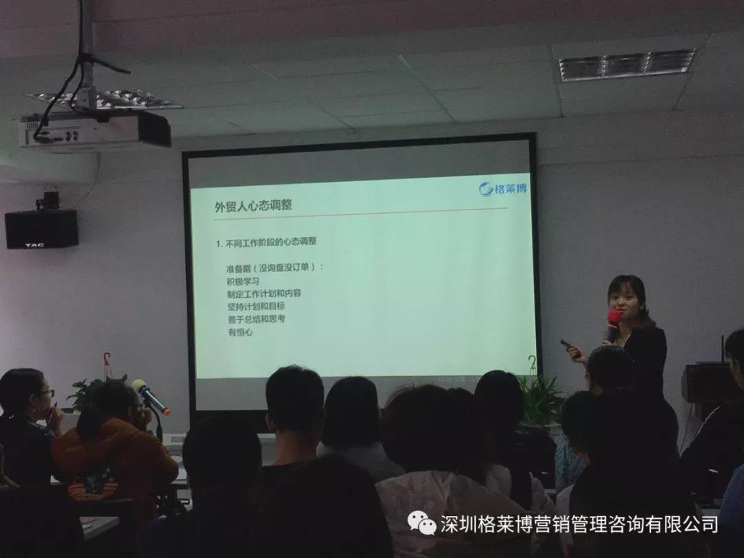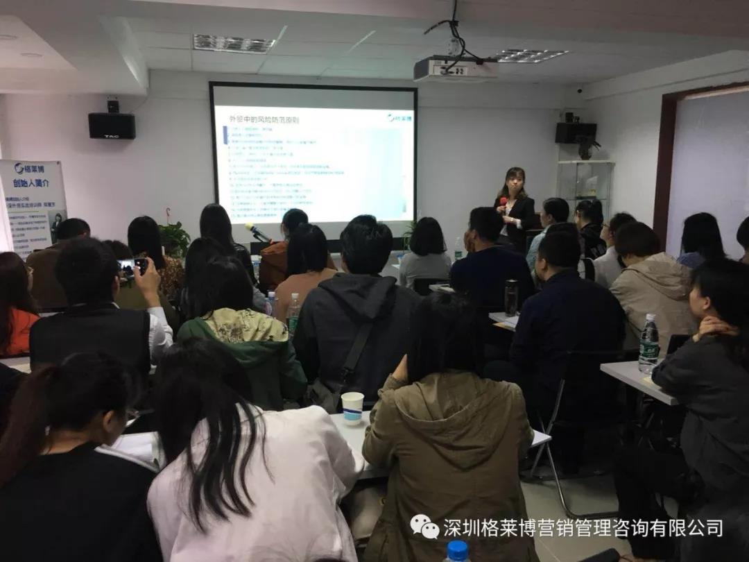 上午课程老师就给各位外贸学员们解析了优秀外贸业务员的必备素质,开拓了大家的思维,给学员们罗列了业务员如何从一个新人快速蜕变成行业精英的必备潜质和方法,教你怎么弄懂七大特质,再从当前主要的贸易形式进行剥析,分析了B2B,B2C,C2C,C2B四大火热模式,让你真真正正的理解其中的含义,不再盲目。还带来了外贸人容易中招的询盘风险,从外贸实际中的风险邮件实例,发货风险,付款风险等等等,任何一个都会让人头大的潜在危险,我们的jenny 老师都为你一一解析,并且为伙伴们带来了行业风险防范的原则和方法,外贸人员的心态如何进行调整,业务开展的基础准备有哪些,自己本身和客户对产品的常见疑虑怎么解决,常见客户的FAQ,行情了解的途径,只有理解了这一切,才能在最快拿到大订单大客户,只有在这里,在格莱博才能学到的喔!