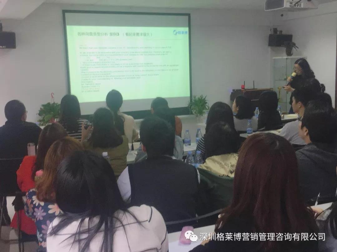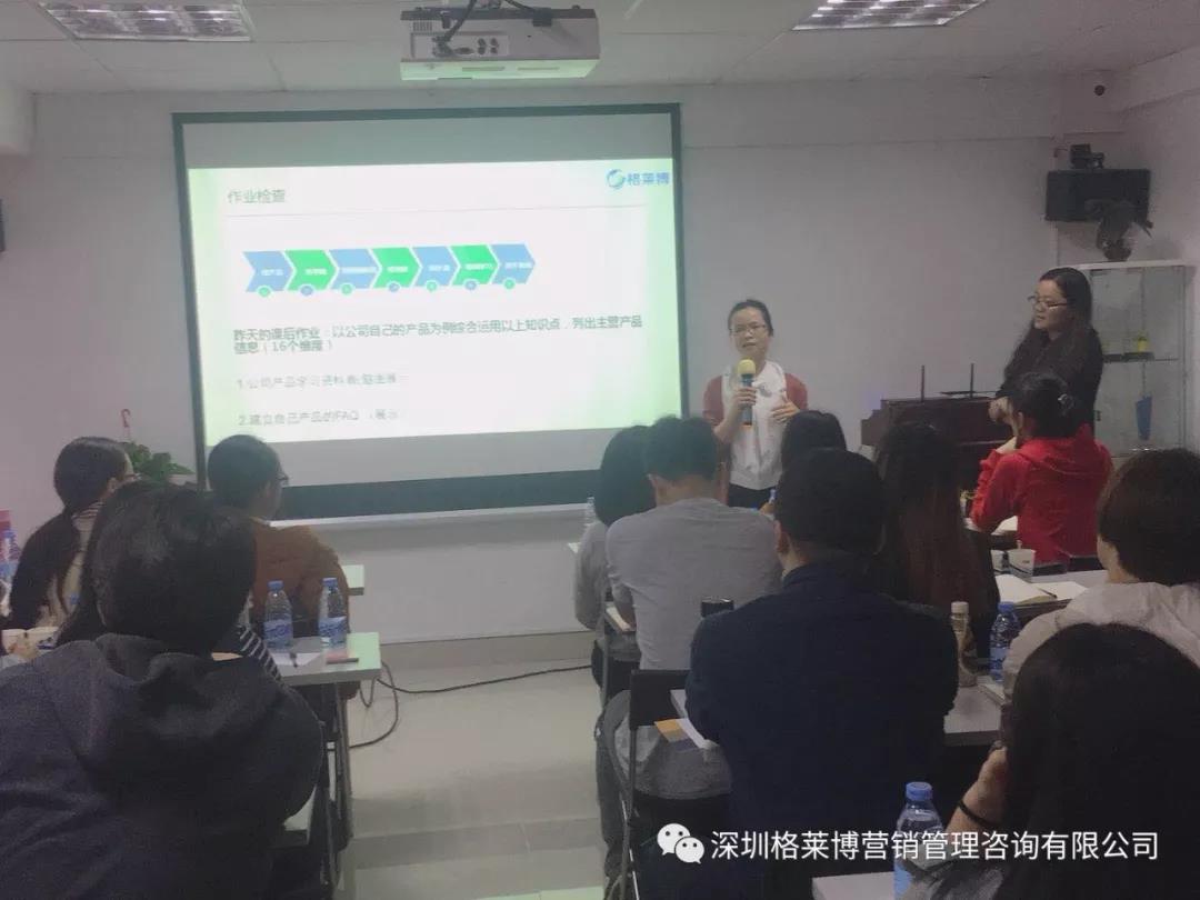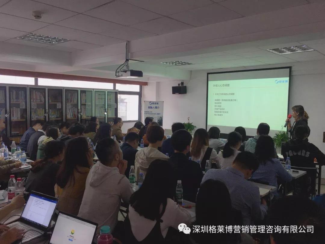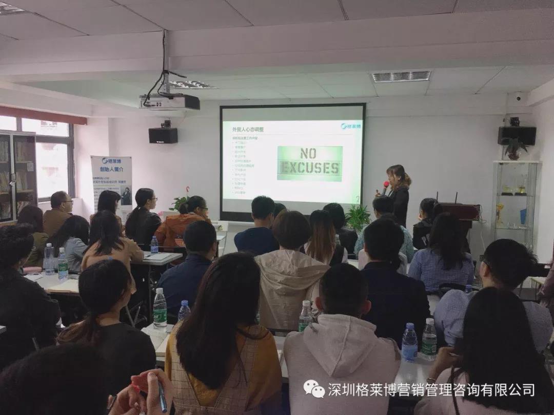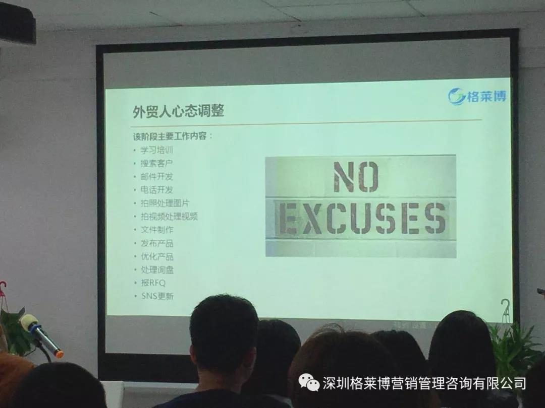 下午一开始就直击所有人的痛点,接着讲到怎么面对不同的客户不同的回复,报价一整套流程需要的细节剥析,客户还价该怎么应对,谈判技巧和多类的跟进技巧。所有面对客户一系列的详细技巧,都在这里可以学到,不知道客户怎么去接待?不知道怎么给客户打电话?上完课就有了更多的渠道去开发客户和营销自己,让以前的传统的思维更开放。现场拿多个不同角色客户分析教你怎么面对面沟通,应该注意什么,怎么进行催单,怎么扮演各种角色跟客户沟通,客户如果不回复怎么办+破解方法对策。等等等一系列的干货,绝对让你焕然一新,将八年九年的外贸经验都传授出来,不留余力,格莱博只为育人,育外贸精英!