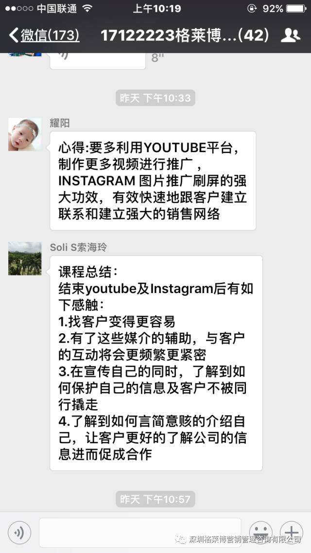 并且是源源不断的客户资源进来,这些都是精准的意向客户哦!在Instagram还可以找到正在开展会的客户,而且是当天就会找上门的客户,这可是慧芳老师的独门绝技呢,只有在这里,在格莱博才能学到的喔!有学员表示上了课之后可以更快速地跟客户建立联系和建立强大的销售网络,一下子又多了很多打开市场的渠道和方法。还有深夜一点多就得到200以上的客户直接过来的
