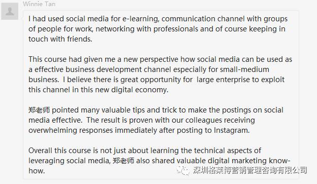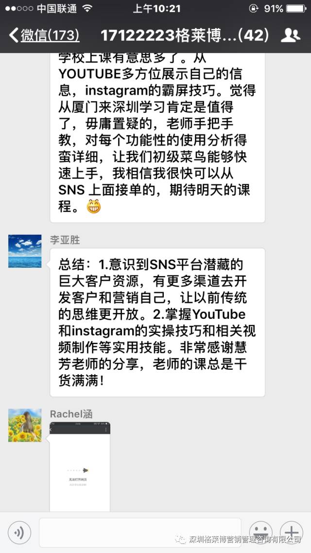 慧芳老师还是辛勤教学,手把手实操教导每一位学员深入理解SNS,有学员表示,来听课程前,对SNS的认知还是初级菜鸟,只是守株待兔或者是等客户主动添加自己,不懂得如何出击,上完第一天的课程就感觉干货满满,意识到SNS平台潜藏的巨大客户资源,有了更多的渠道去开发客户和营销自己,让以前的传统的思维更开放。