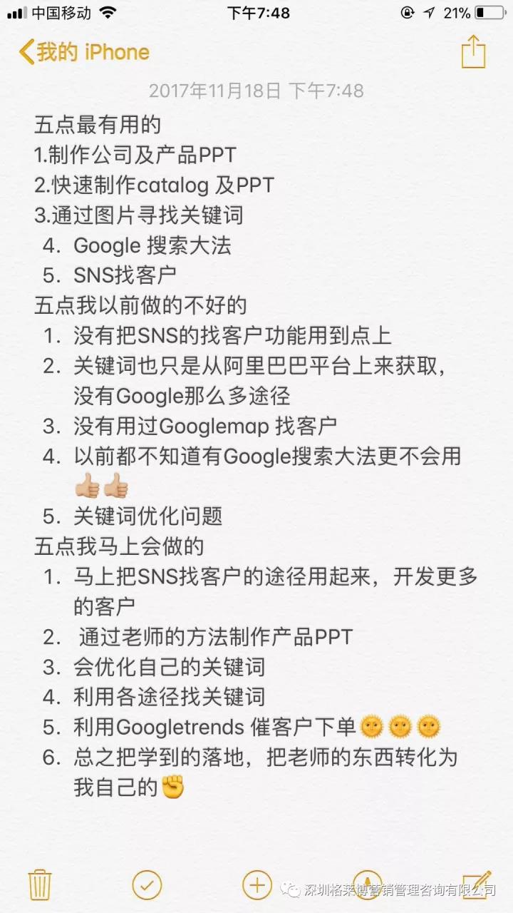第二天外贸界FBI郑慧劳老师从客户分析大法到阿里巴巴的操作,阿里巴巴后台数据如何分析客户,如何发布阿里巴巴产品标题,获得更多点击;如何写阿里巴巴产品详情,获得更多反馈;如何找到更多适合自己的关键词,五千一万关键词都不在话下。还有通过谷歌地图,谷歌图片深挖客户,怎么插入视频,如何做电子报等,以及邮件的深度讲解,包括标题应该怎么样写,怎样避免邮件进入垃圾箱,邮件正文怎样写抓住客户的心。像侦探一样客户读了你的邮件立刻知道,慧芳老师FBI的称号实至名归,让大家感叹套路太深,外贸路上从不缺努力的人,但只有好的方法+努力的结果才能事半功倍。有学员听了这两天的课程,才发现自己之前的都是皮毛,现在开阔了思路,拆掉了思维的墙,刷新了自己对外贸的看法。