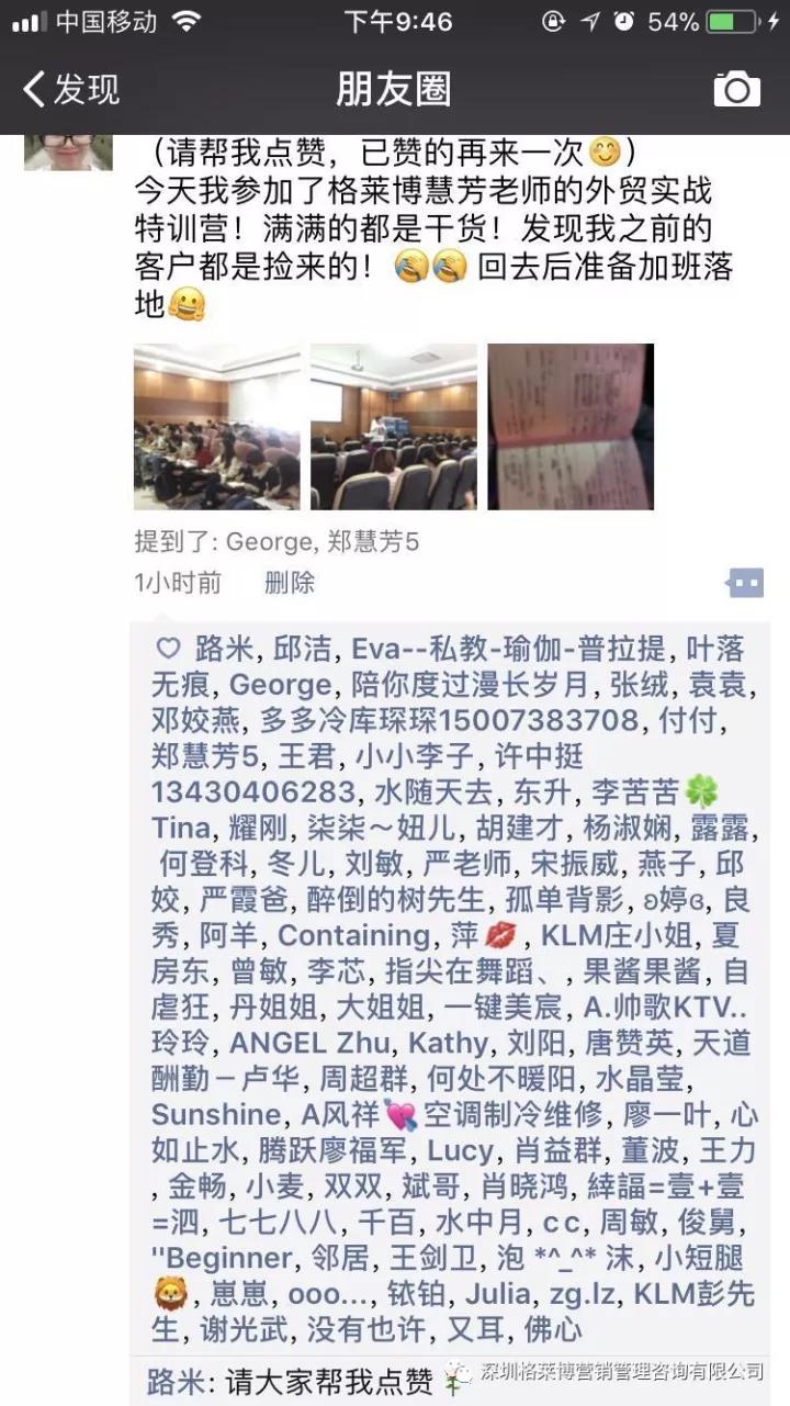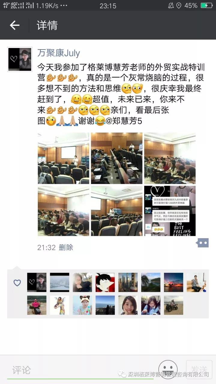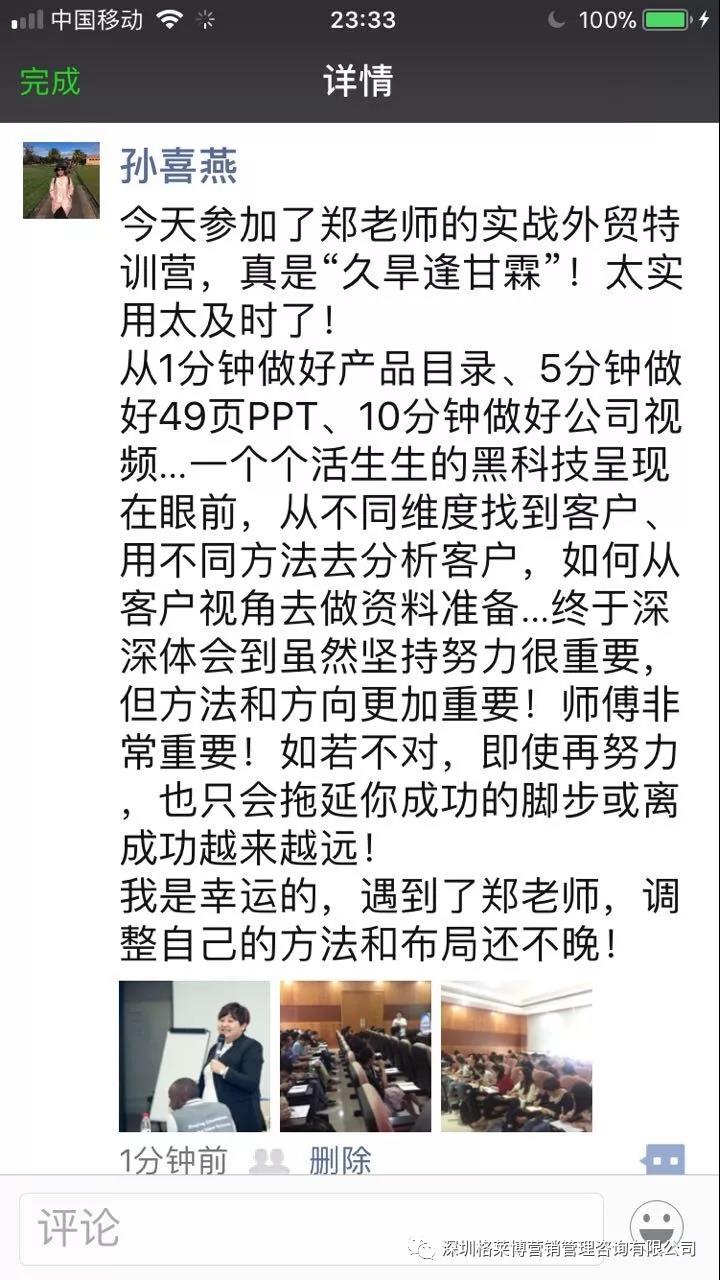 有学员感叹参加了慧芳老师的课程,满满的都是干货,发现自己以前的客户都是捡回来的不是自己去挖掘的,更有学员表示上课之后发现外贸不难做,只是没有找到合适办法,上慧芳老师一节课,少走五年弯路,真的超值。烧脑的一天,但是畅快淋漓,一个个活生生的黑科技呈现在眼前,庆幸遇到郑老师!!!亲爱的学员们,一个亿在等着你们!加油。