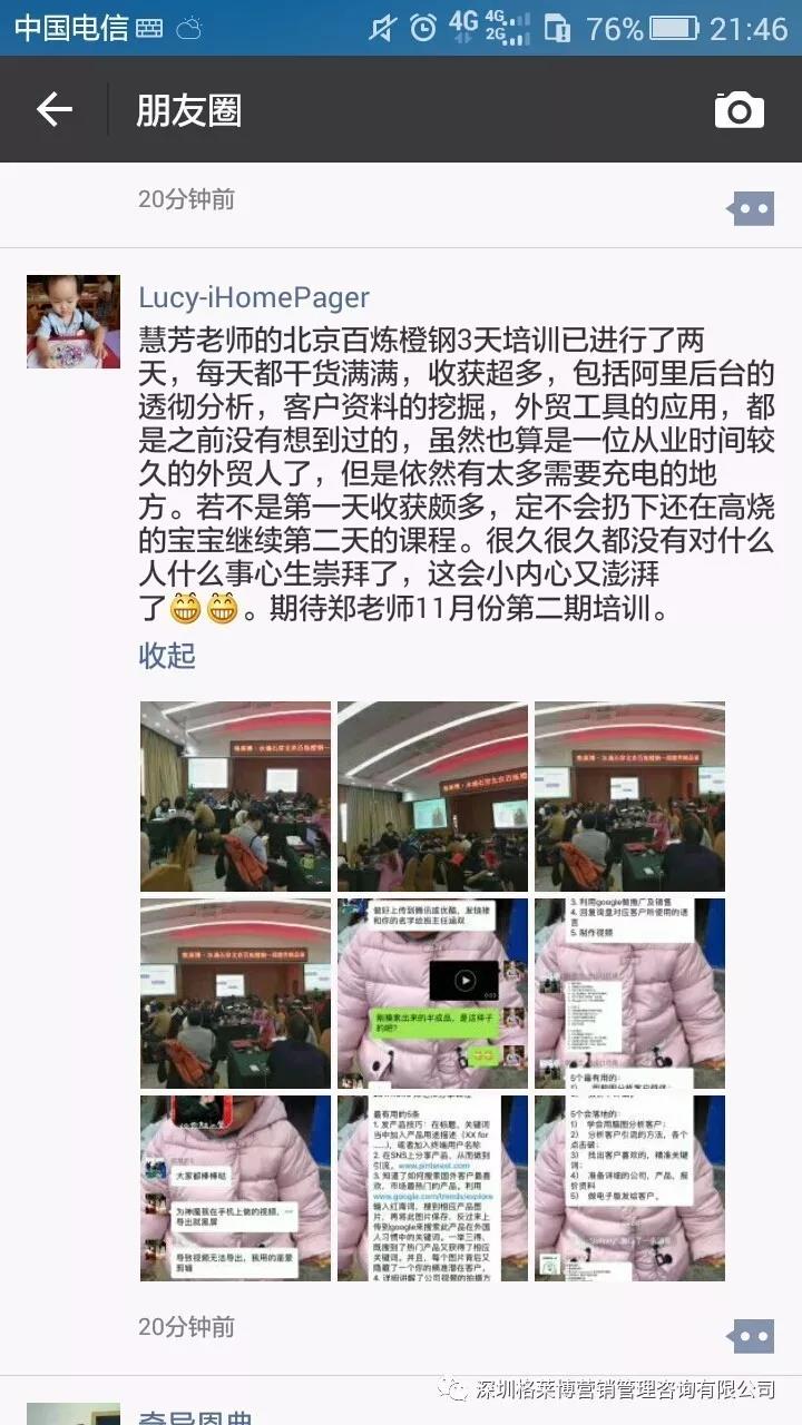 课程结束之后,学员们纷纷发来感想,感谢慧芳老师的干货分享!三天课程下来,同学辛苦了!希望你们回去按照郑老师讲的操作方法,好好落地,利用老师教的办法和操作进行实战,相信你们能拿下大订单!回来跟郑老师、同学们报喜。