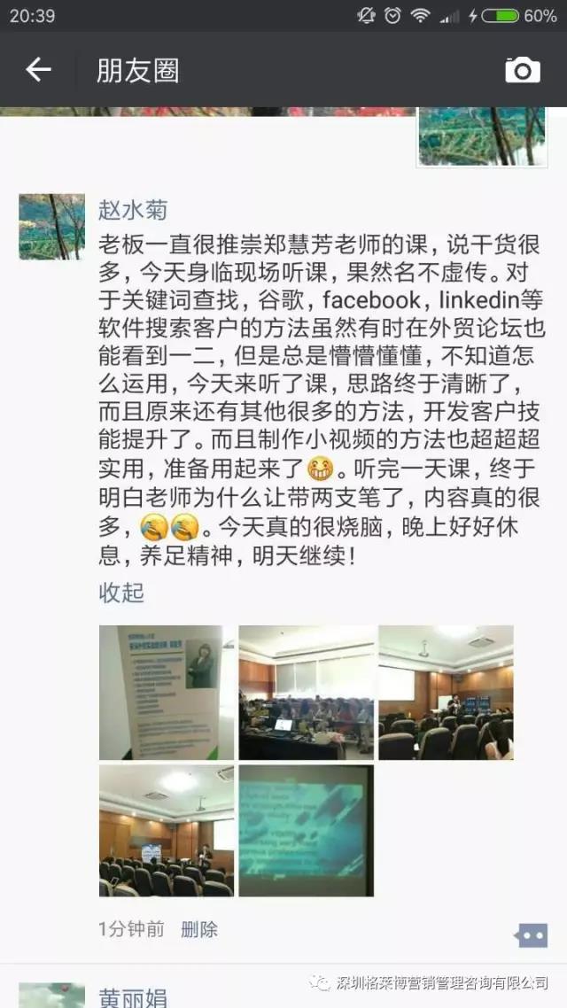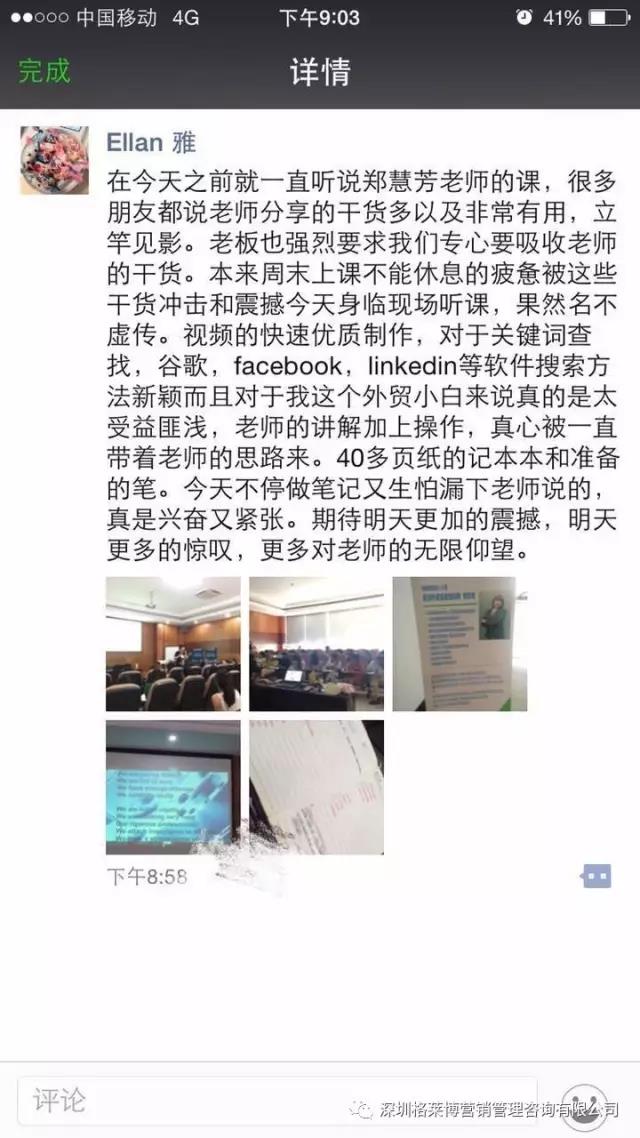 多维度,多手段找客户,高效率的做出PPT和产品样本,公司视频的快速优质制作,最大程度的利用好谷歌定位客户以及各种精彩的外贸营销手段,一天的时间,有学员就已经记了十几页笔记,说终于明白老师为什么要大家带两支笔了,干货太多了。还有学员上完第一天课程,就马上定了一个课程套餐,让团队一起提升。越努力,越幸运,加油哦!