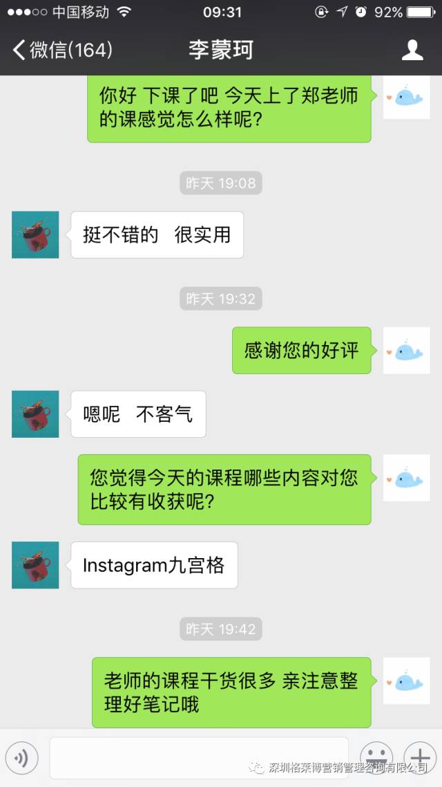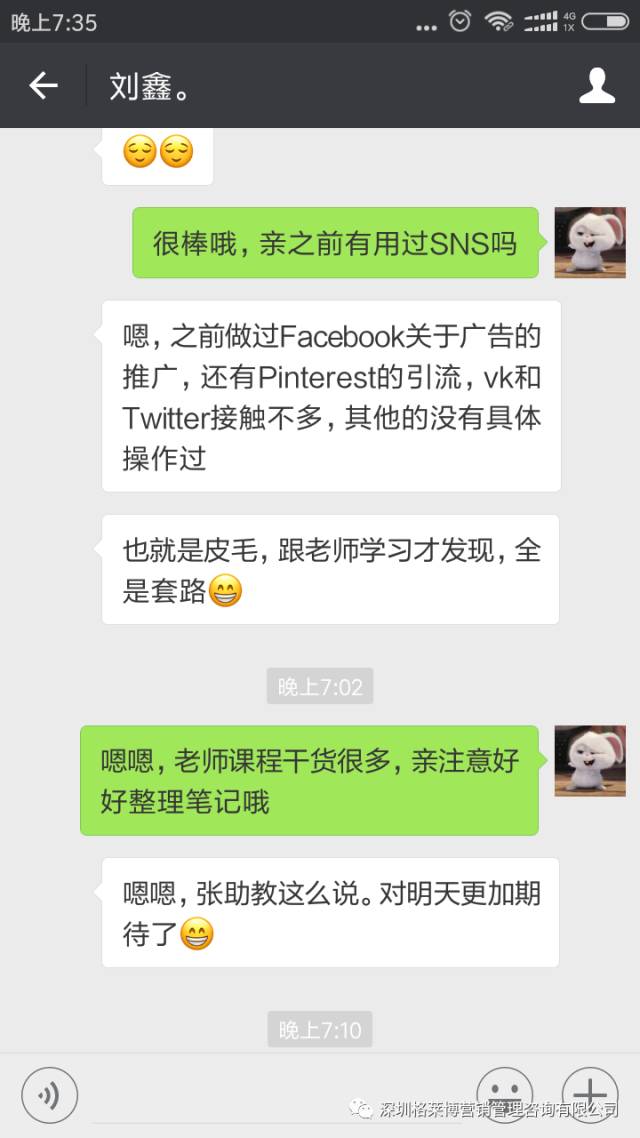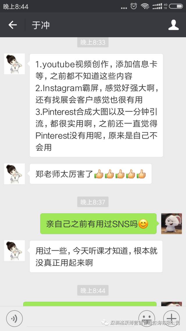两天的时间,全程实操,从SNS的基础操作到营销方法。课程当晚,就有学员开始落地,并且马上就收到客户询盘。第二天早上,大家纷纷晒出自己的成果,为大家的学习精神点赞哦!