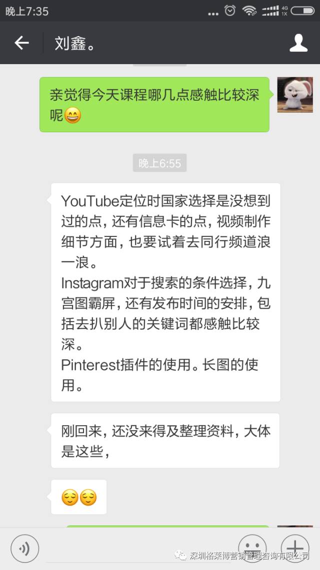 课程第一天,就打破了大家以往对Instagram、youtube、Pinterest的认知,之前都还觉得这些没什么用,现在才发现是自己不会用。Instagram一张图霸屏,还能找展会客户。Youtube得视频创作方法,信息卡的添加。Pinterest的合成图大法及一分钟引流。让大家脑洞大开,推掉了思维的墙。